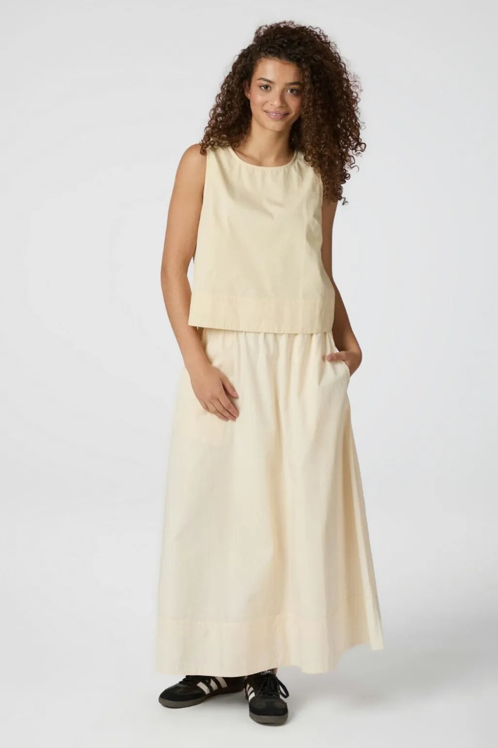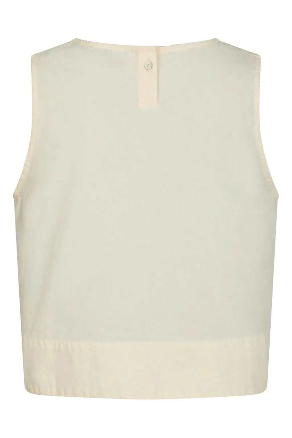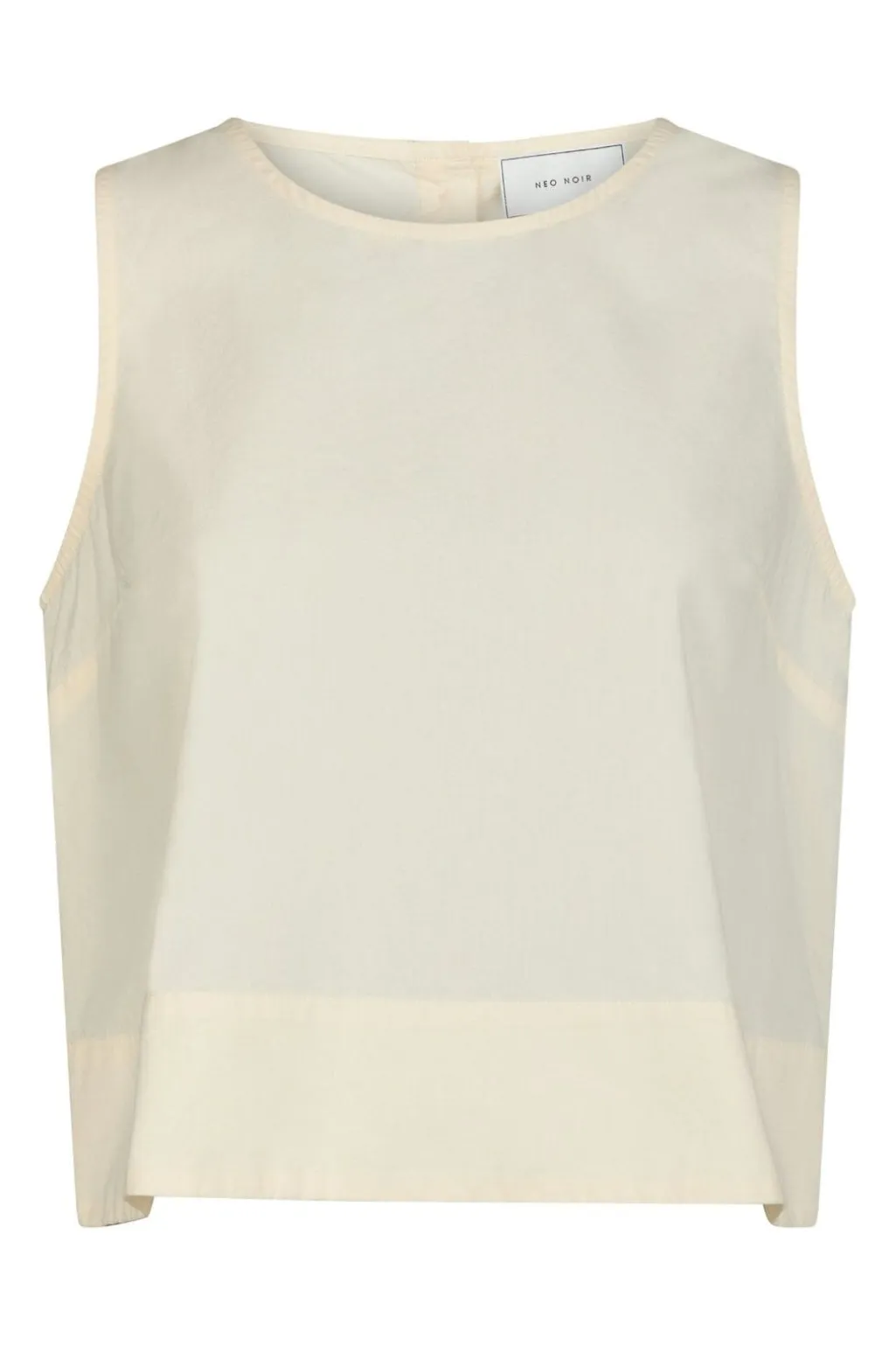 Lys gul top fra Neo Noir i poplin-kvalitet. Toppen har en løs pasform med v-halsudskæring, bindebånd og flæsedetaljer. Den ærmeløse stil giver et sommerligt udtryk.