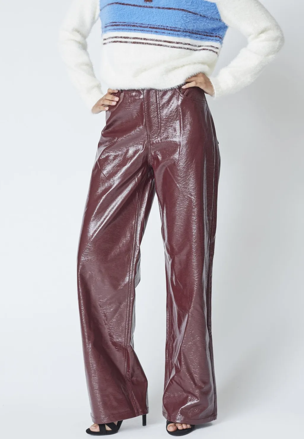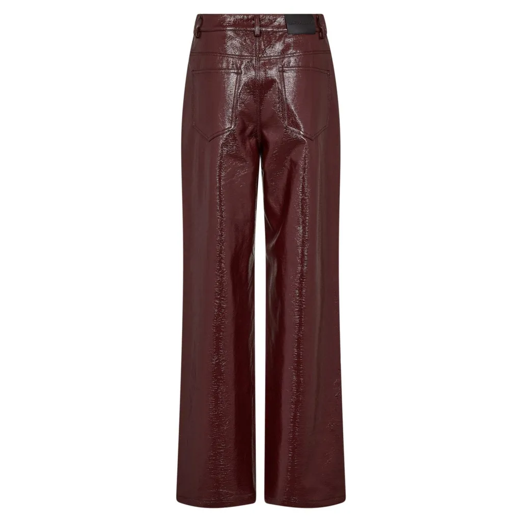 Bukser fra Co’Couture, lavet af 100% PU i en dyb vinrød nuance. Den skinnende overflade giver bukserne et moderne præg.