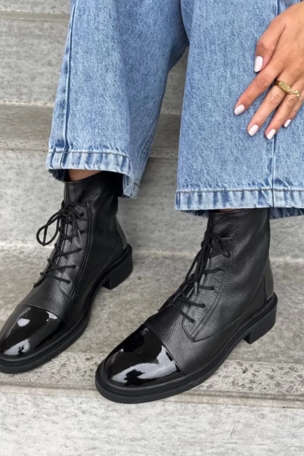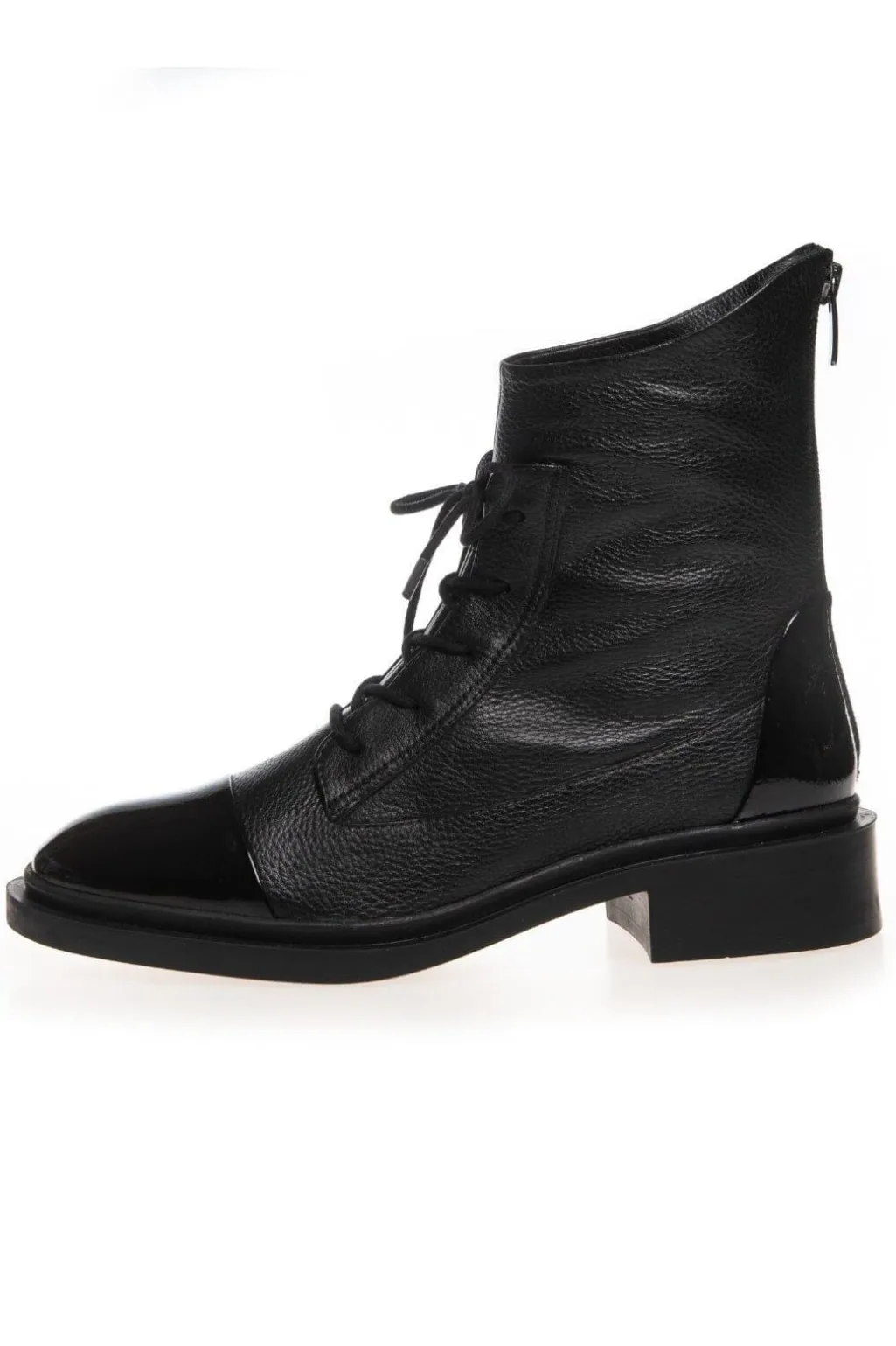 Sorte ankelstøvler fra Copenhagen Shoes med blank patenttå. Støvlerne har både snørebånd og lynlås samt en lav blokhæl.