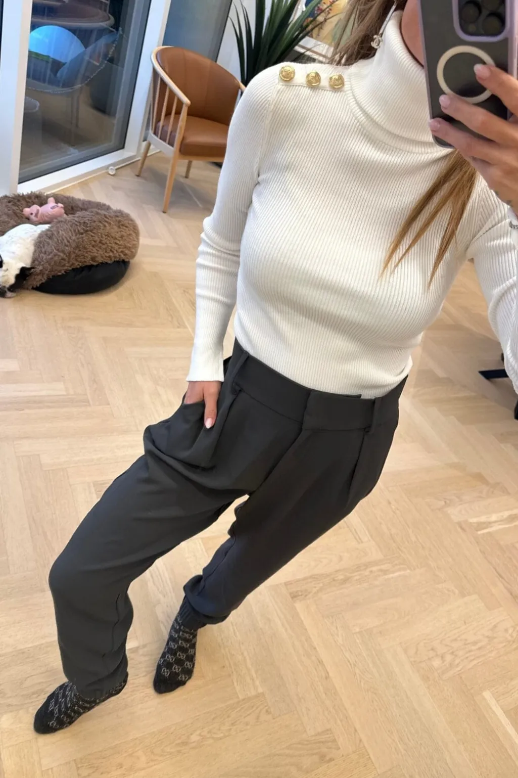 Mørkegrå bukser fra Valentin Studio med draperinger foran. Bukserne har en regular fit og ankellængde med elastik i taljen bagpå og ved anklerne. Praktiske for- og baglommer med dekorative syninger.