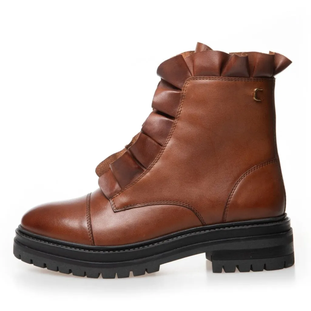 Brun ankelstøvle i læder med flæsedetaljer langs siderne. Støvlen har både snørebånd og lynlås samt en blød latexindersål.