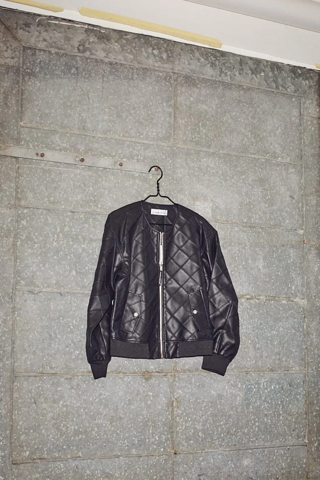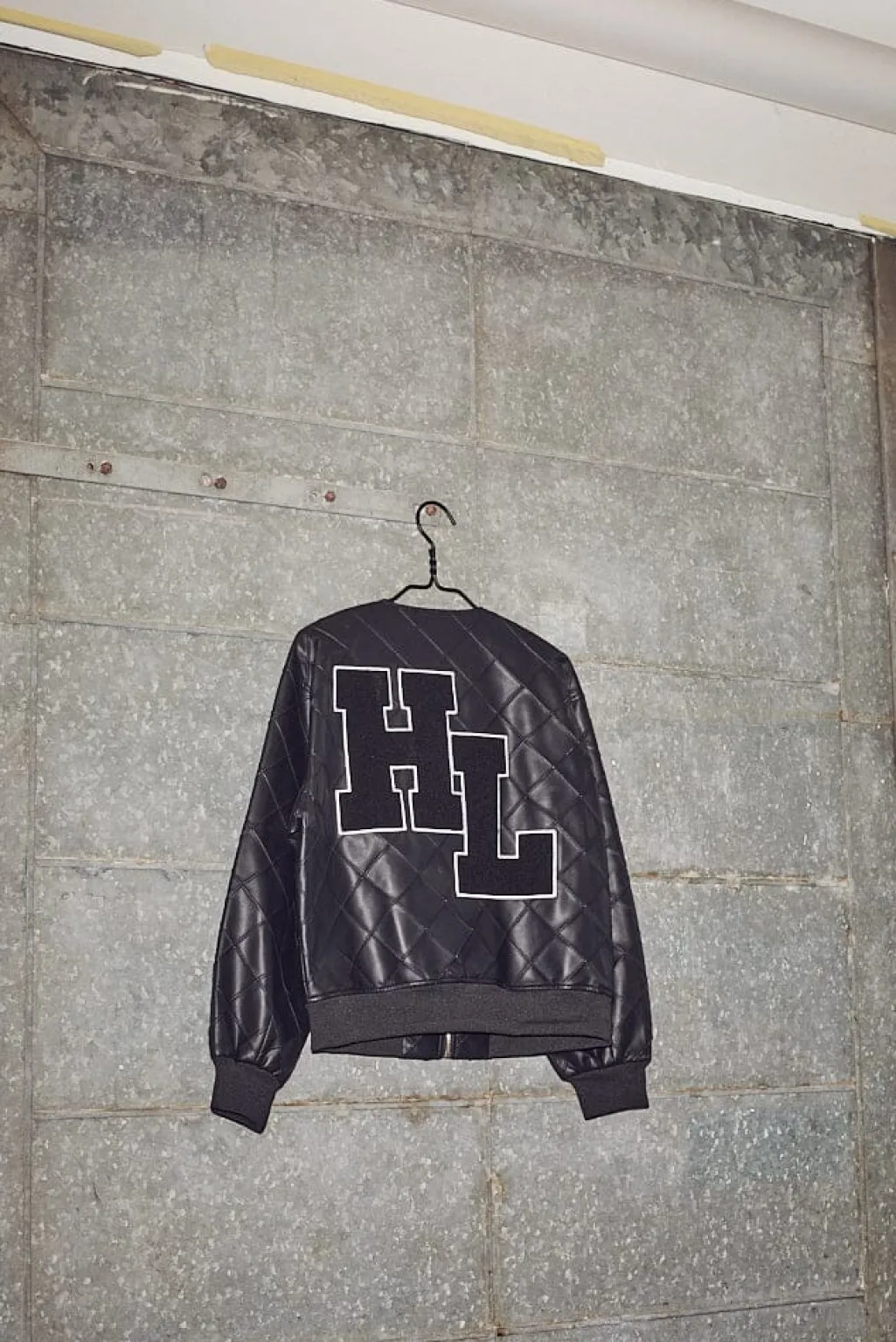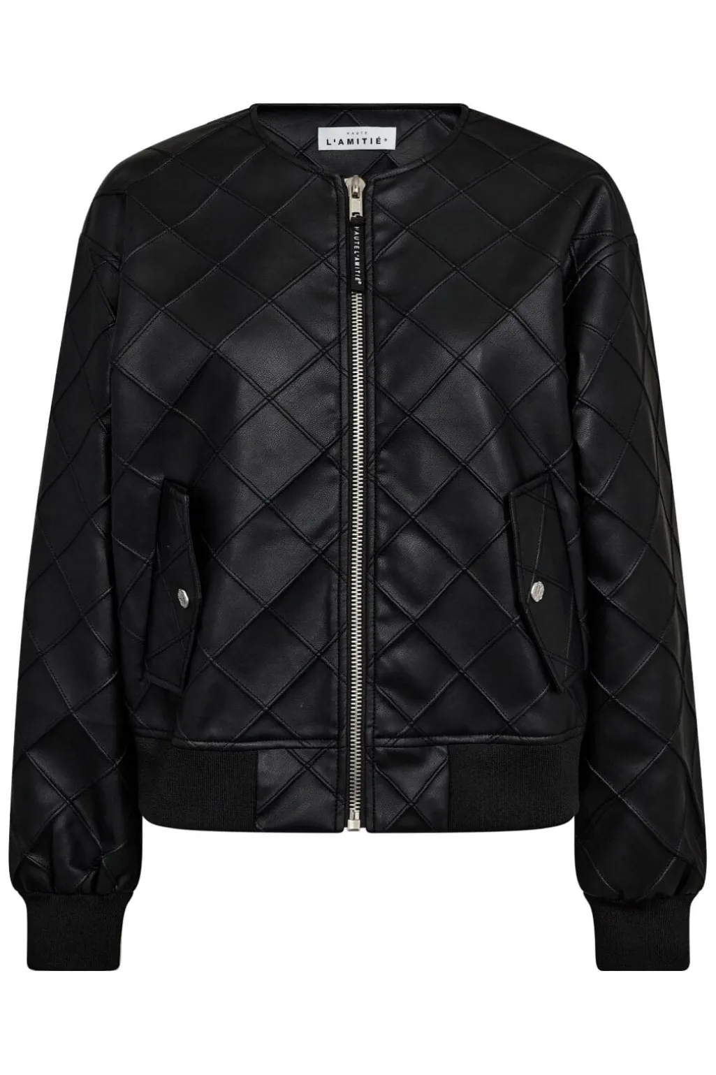 Sort bomberjakke fra Haute L’Amitié med quiltet mønster. Jakken har dekorative syninger og et stort HL-logo broderet på ryggen.
