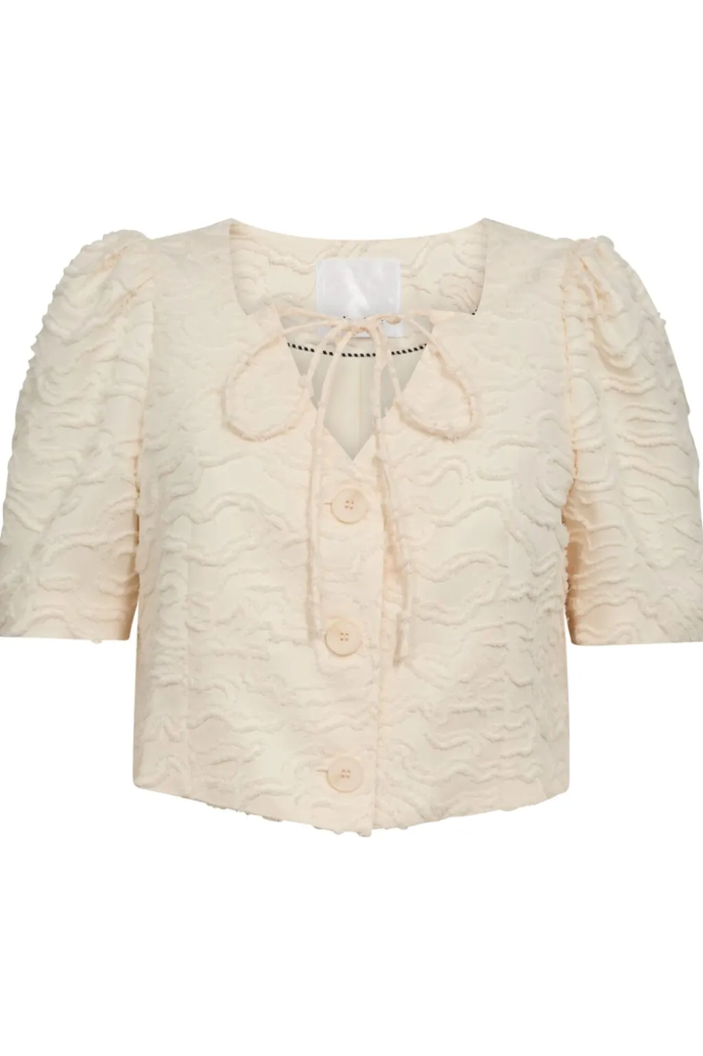 Kort skjorte fra Co´Couture i den lyse nuance ‘Bone’ med bølget mønster. Skjorten har korte ærmer, V-hals og knapper foran samt en bindebåndsdetalje.