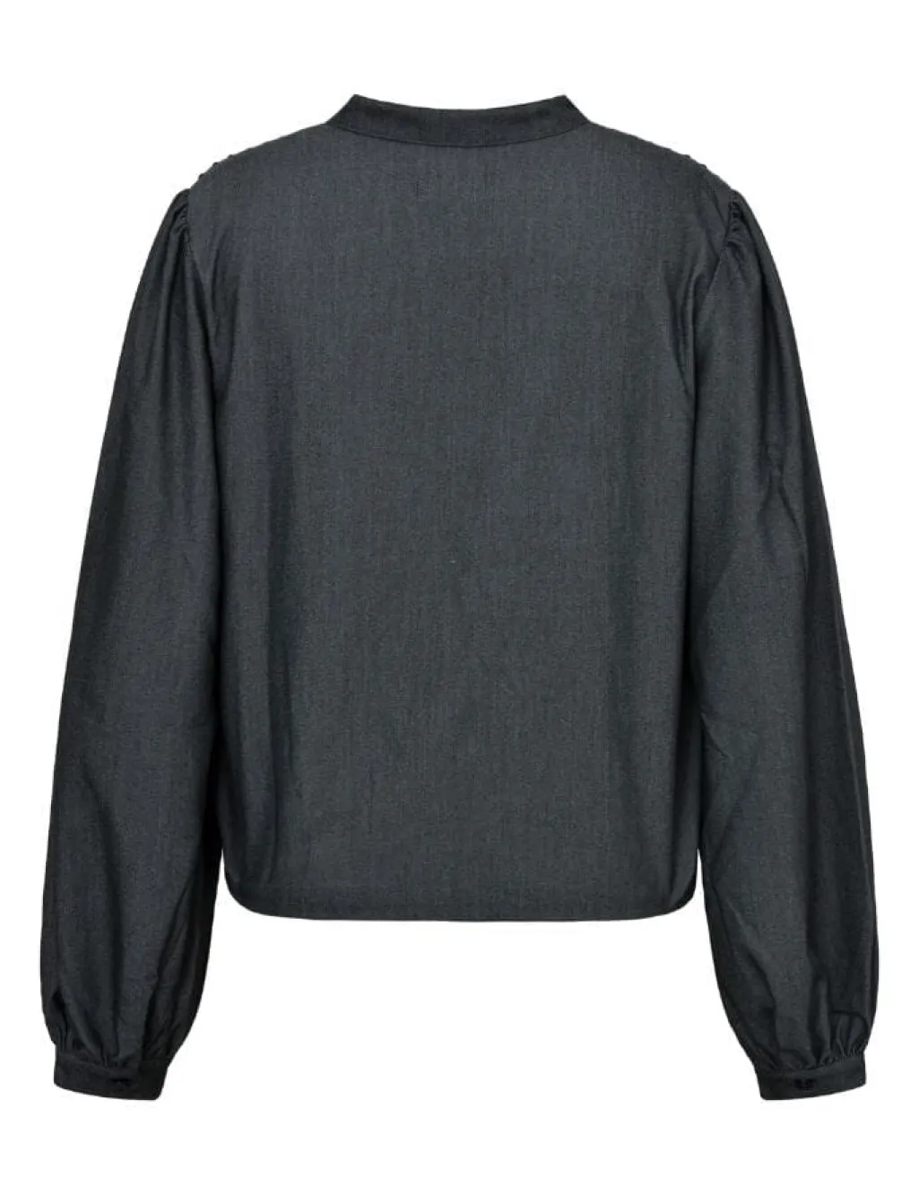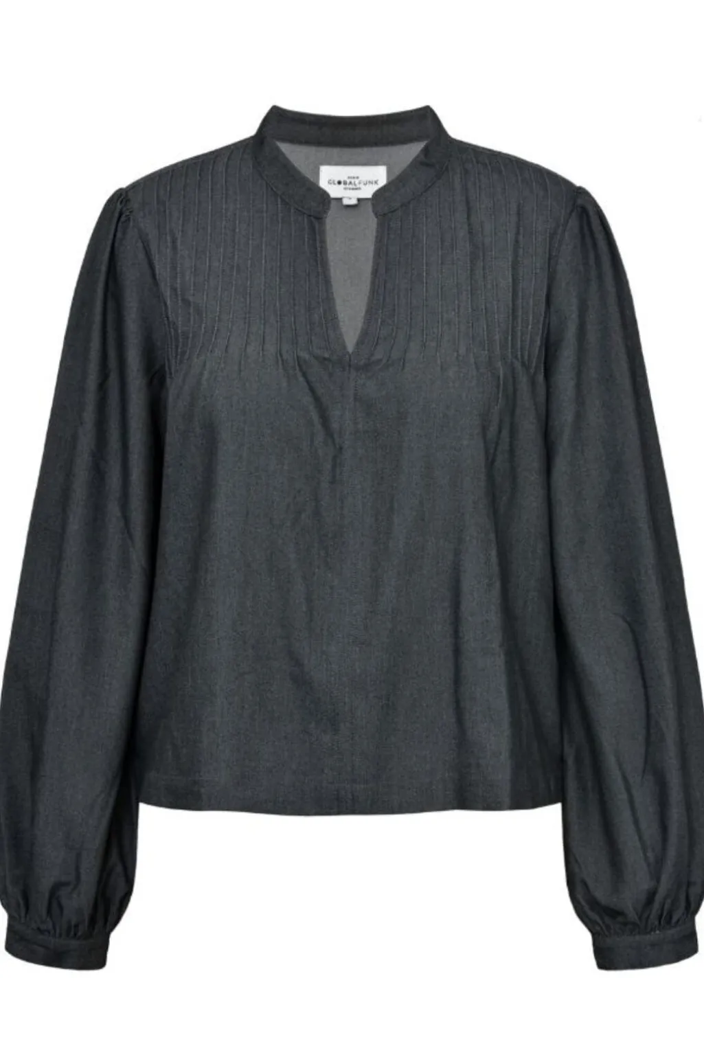 Sort bluse fra Global Funk med v-halsudskæring og lodrette plisseringer. Blusen har lange pufærmer og dekorative syninger, der giver den et gennemført design.