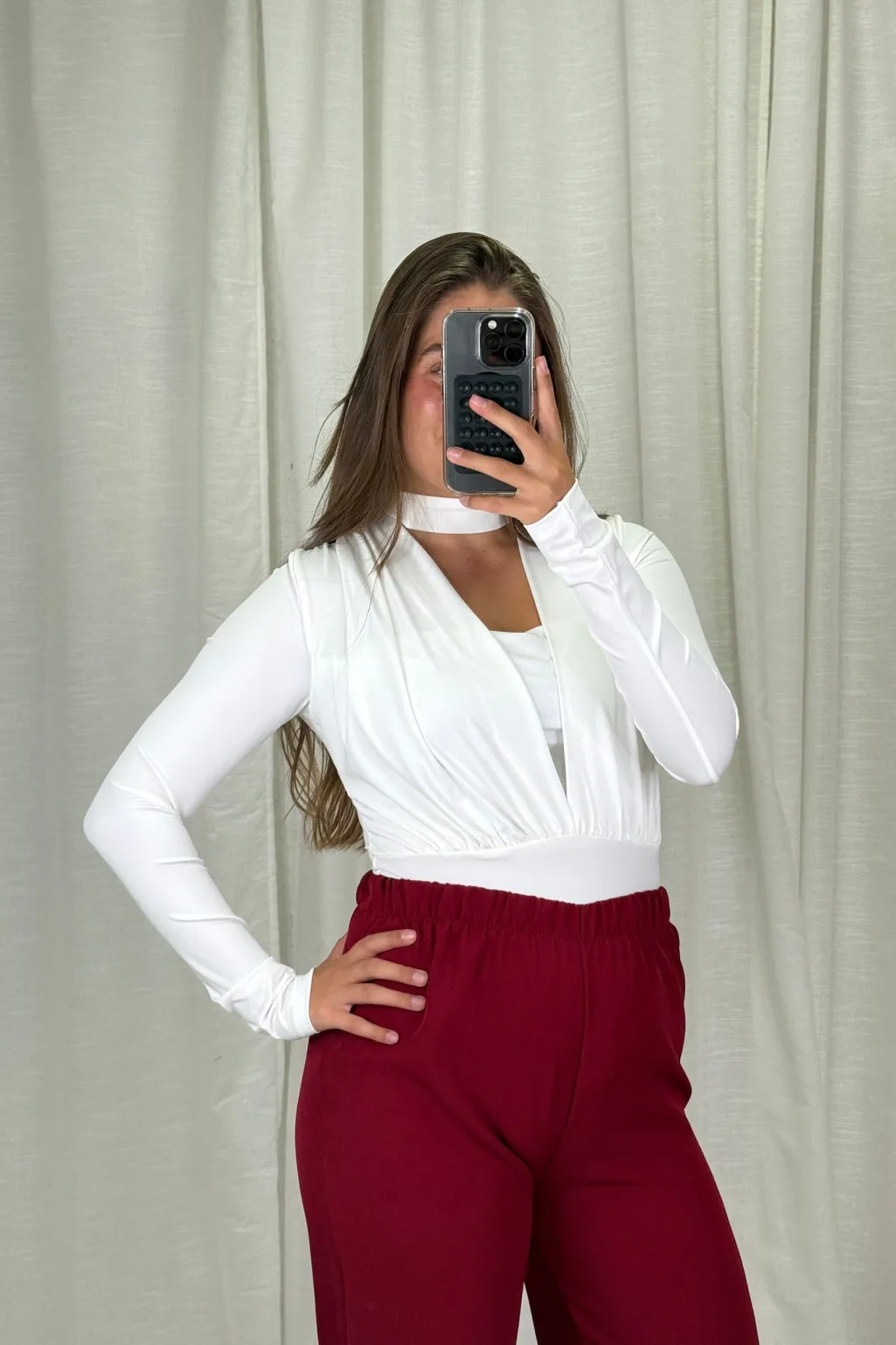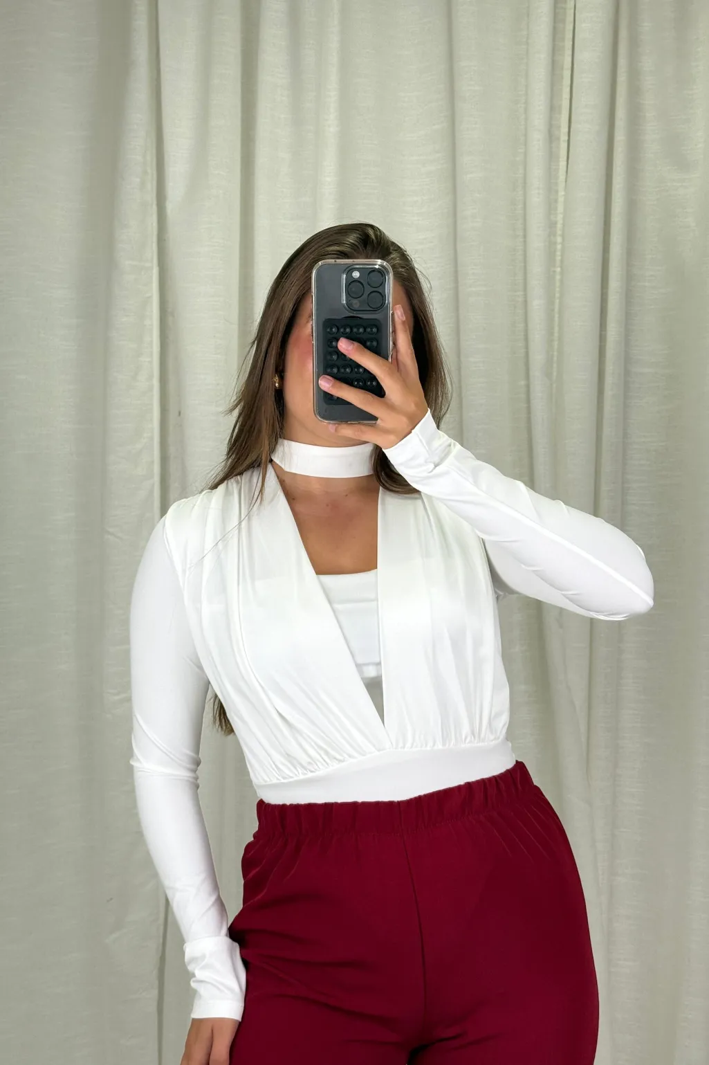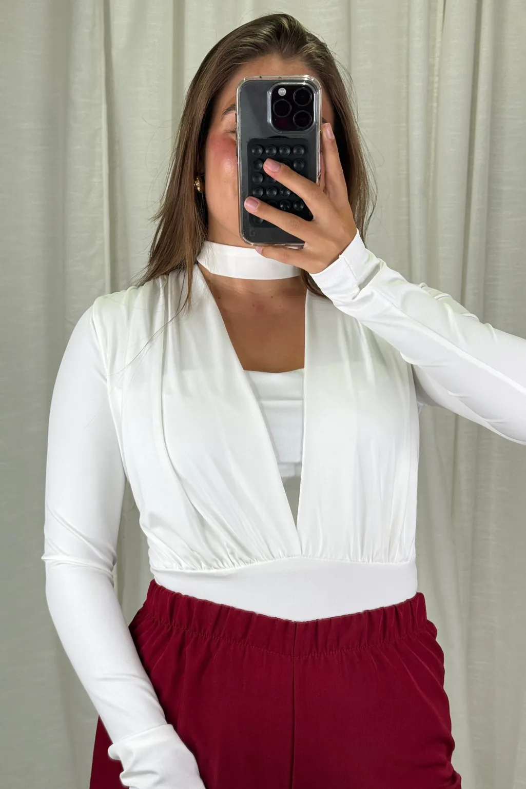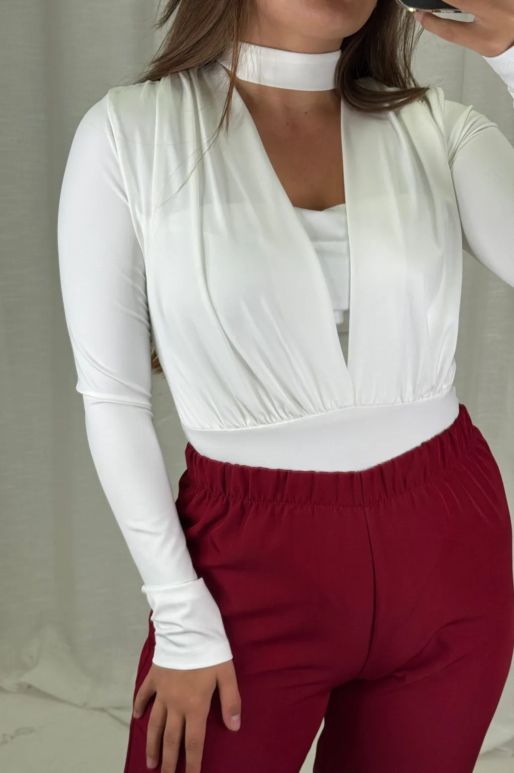 Hvid bodystocking fra A-bee, lavet af en polyester-elastanblanding. Den har lange ærmer og en dyb V-udskæring.