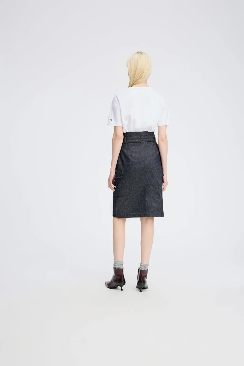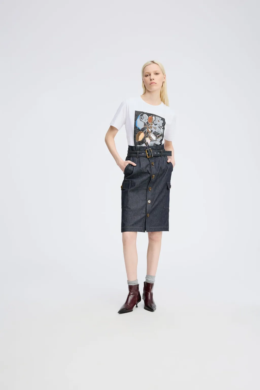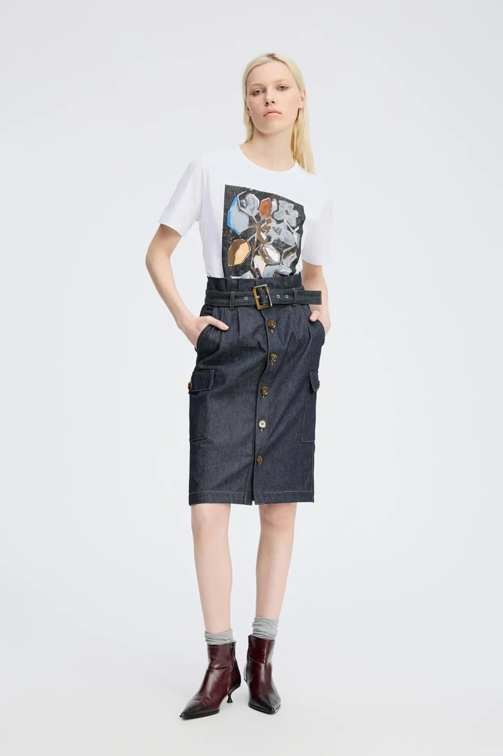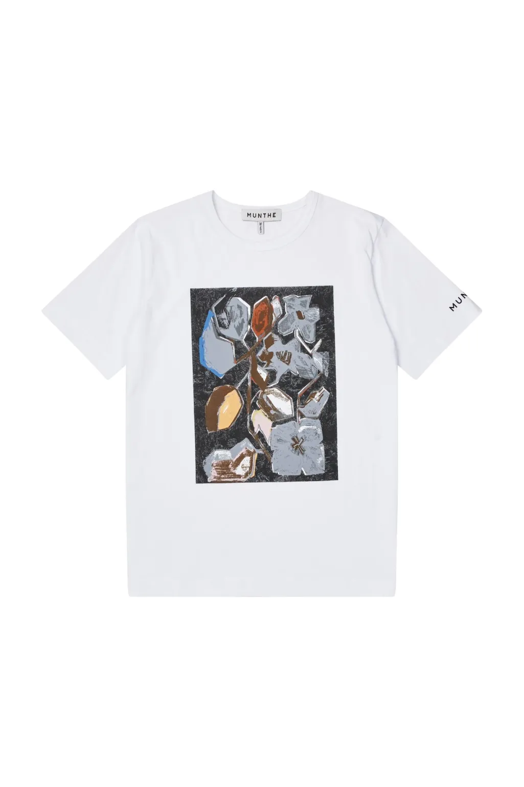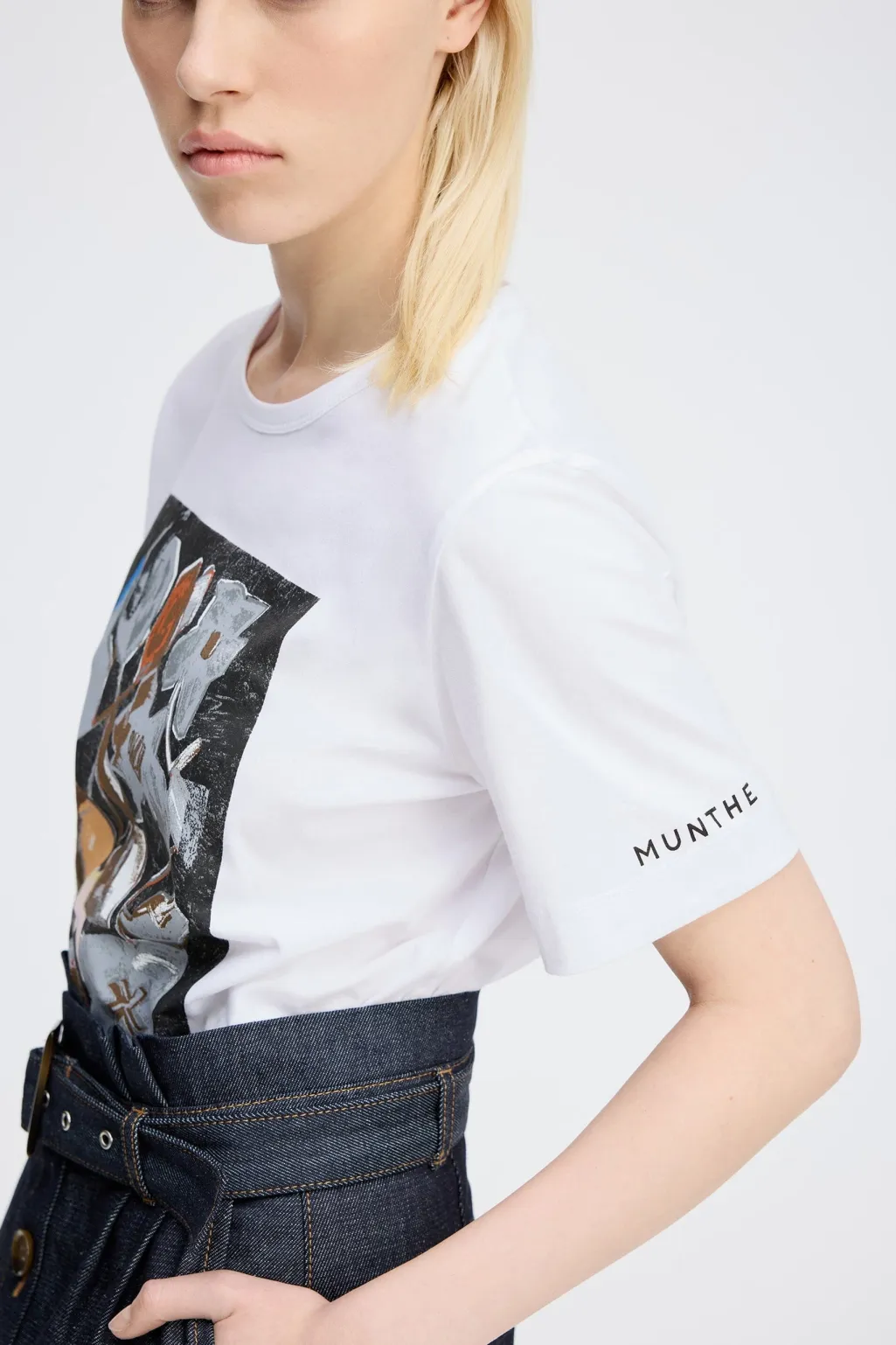 Grå t-shirt fra Munthe med et kunstnerisk print på fronten. T-shirten har en rund hals og korte ærmer. Den er designet med et diskret logo på ærmet.