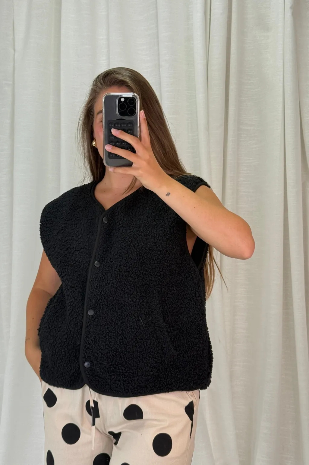 Sort vest fra A-bee, lavet af en holdbar polyesterblanding. Vesten har v-hals og en løs pasform med trykknapper.