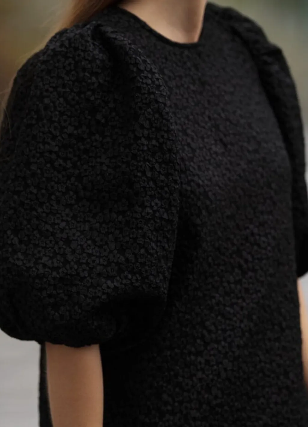 Sort lang kjole fra Noella med blomstermønstret tekstur. Kjolen har pufærmer og snøredetalje i ryggen, samt en V-udskæring og lækkert fald til midt på læggen.