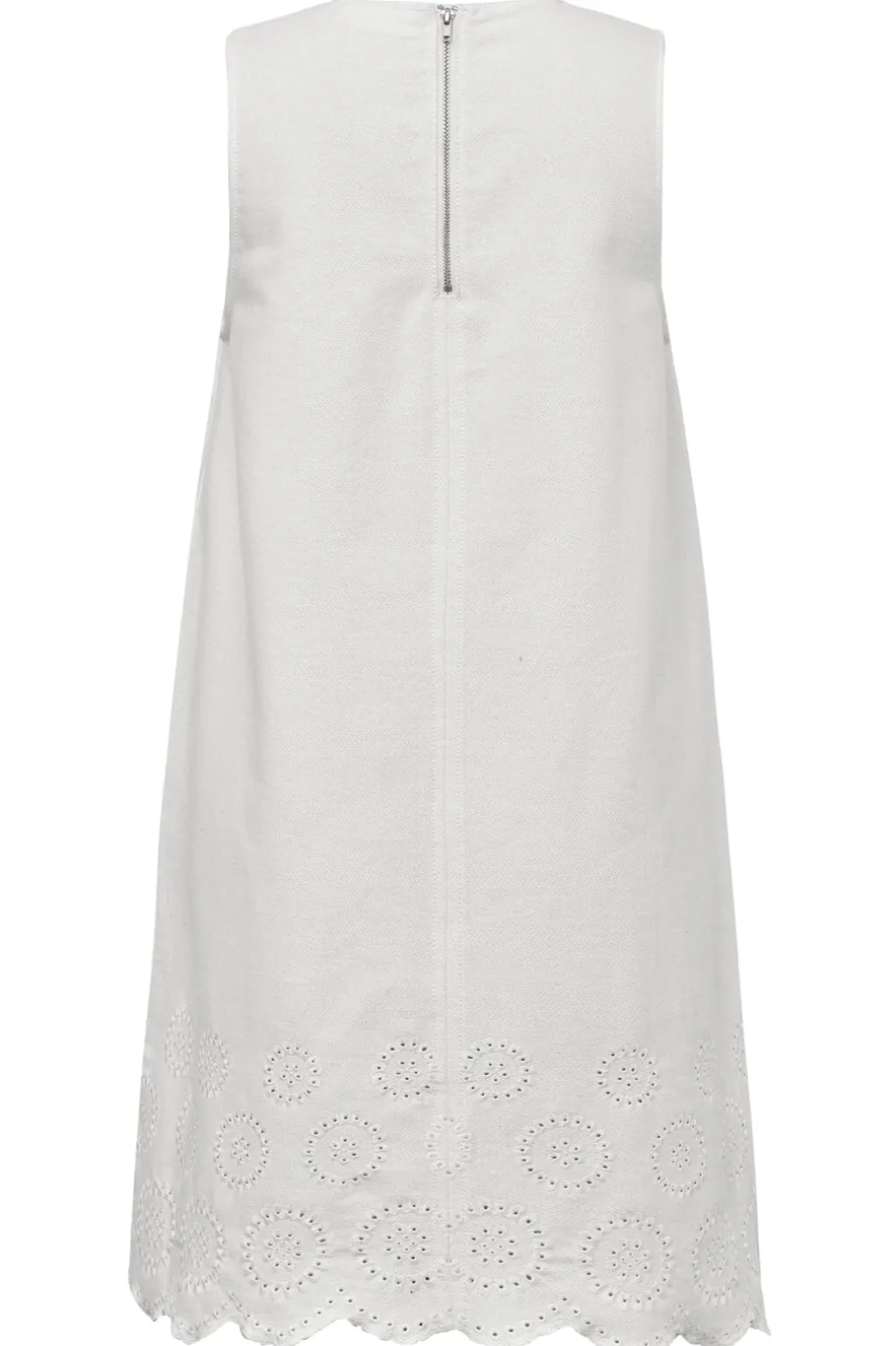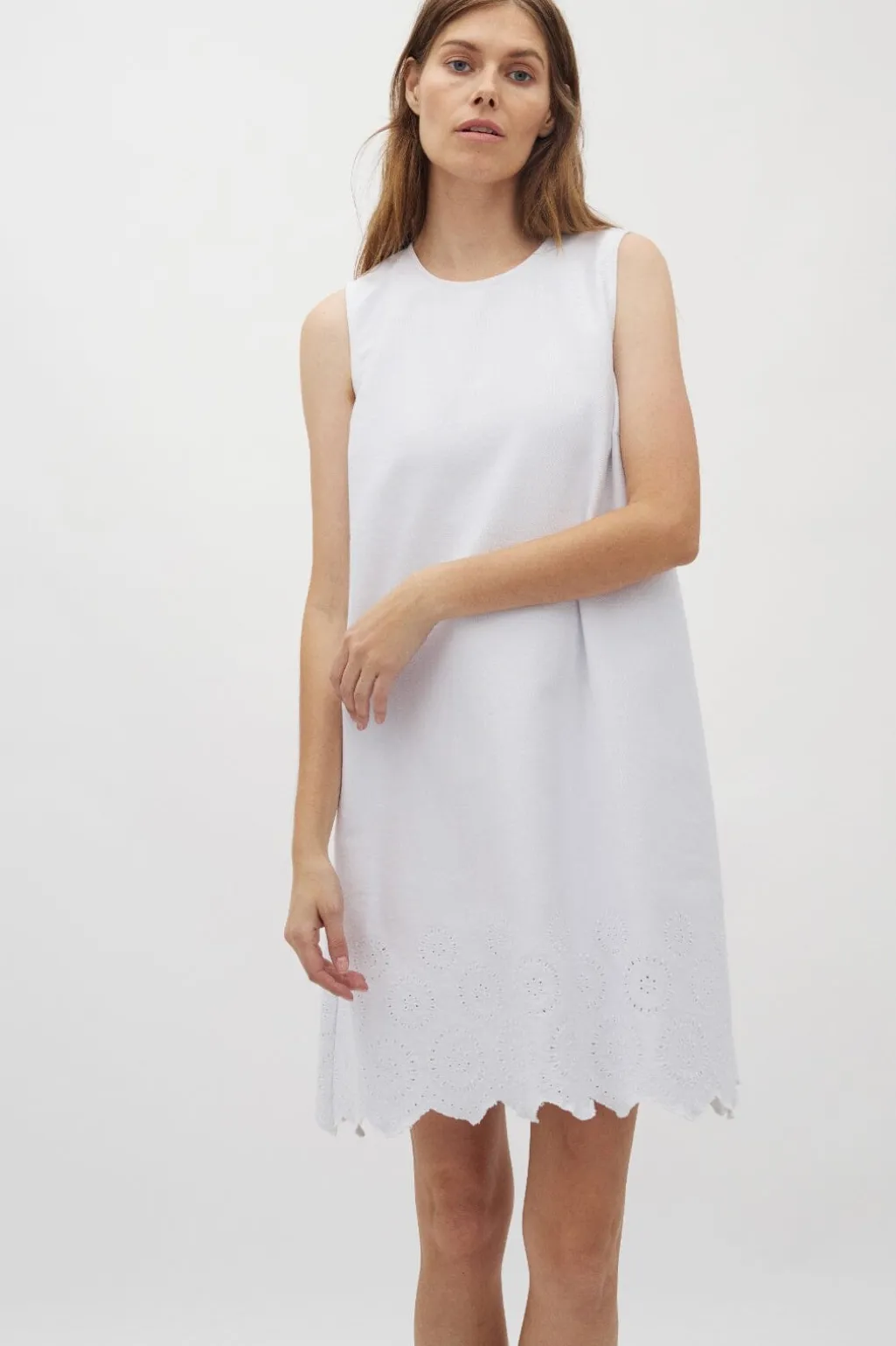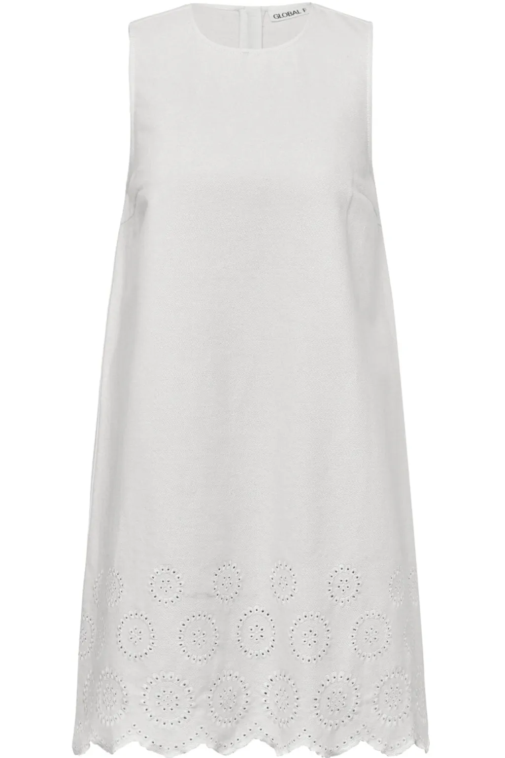 Hvid sommerkjole fra Global Funk i 100 % bomuld. Kjolen har en rund hals og et ærmeløst design med broderede øjne og scallopkant forneden.