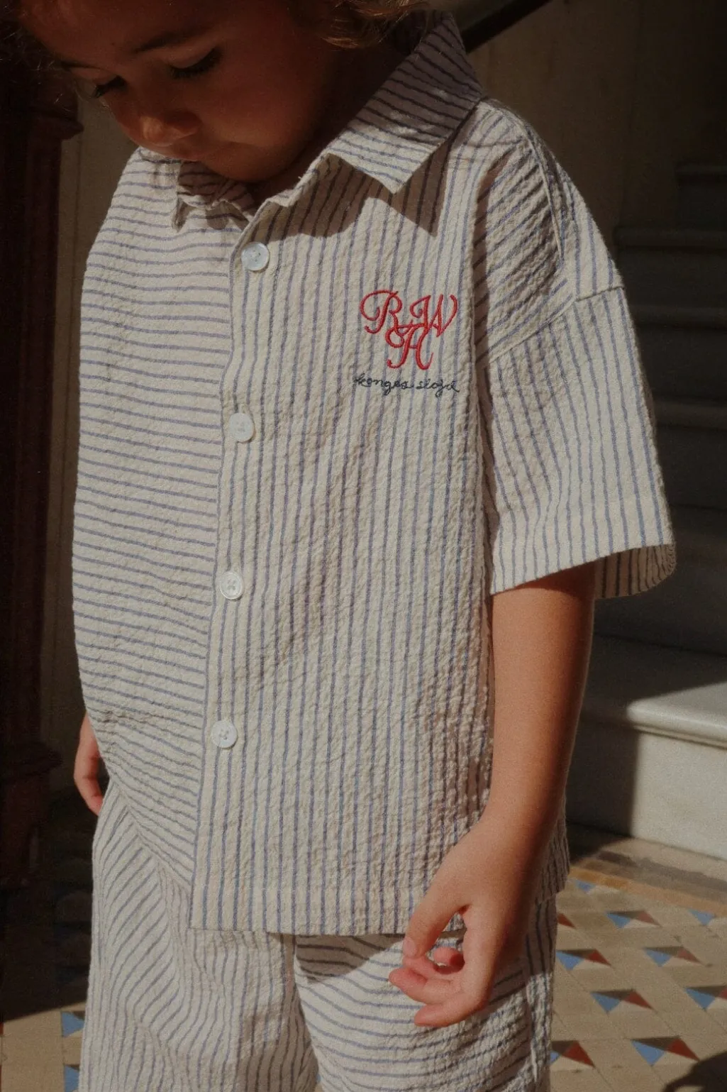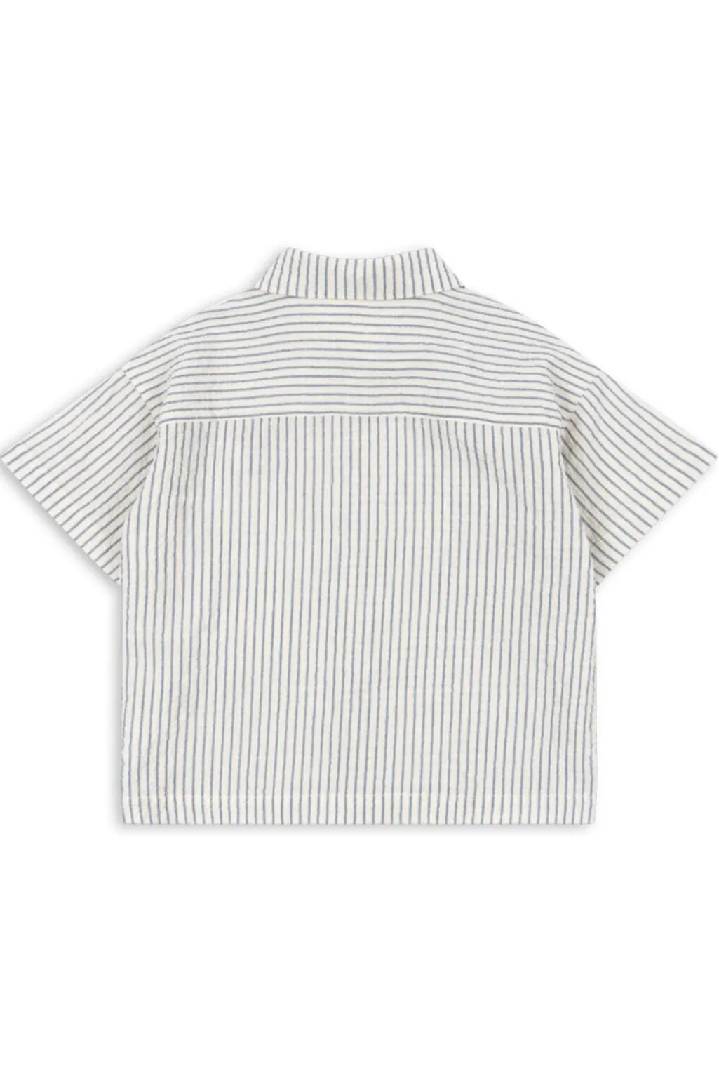 Stribet skjorte fra Konges Sløjd med blå striber på lys beige baggrund. Skjorten har korte ærmer, skjortekrave og rødt broderi med RHW og Konges Sløjd-logo på brystet.