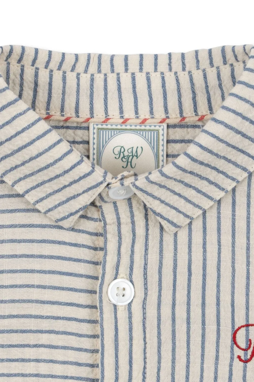 Det røde broderi med RHW og Konges Sløjd-logoet på brystet tilføjer et personligt præg til den stribede skjorte.