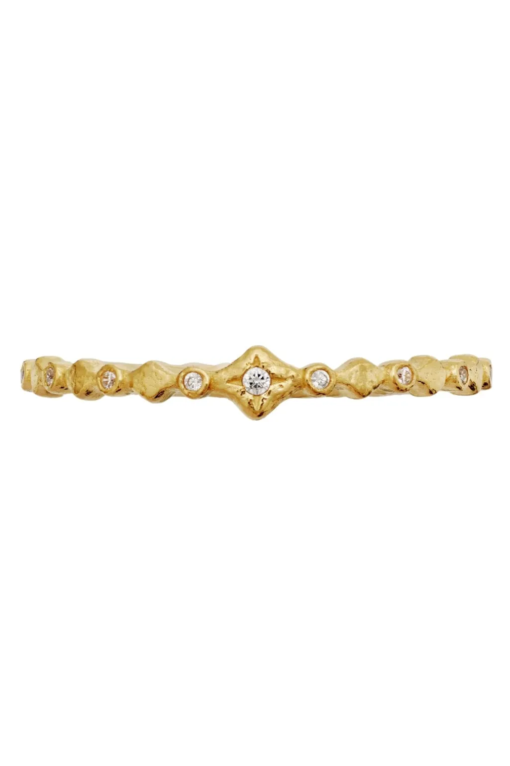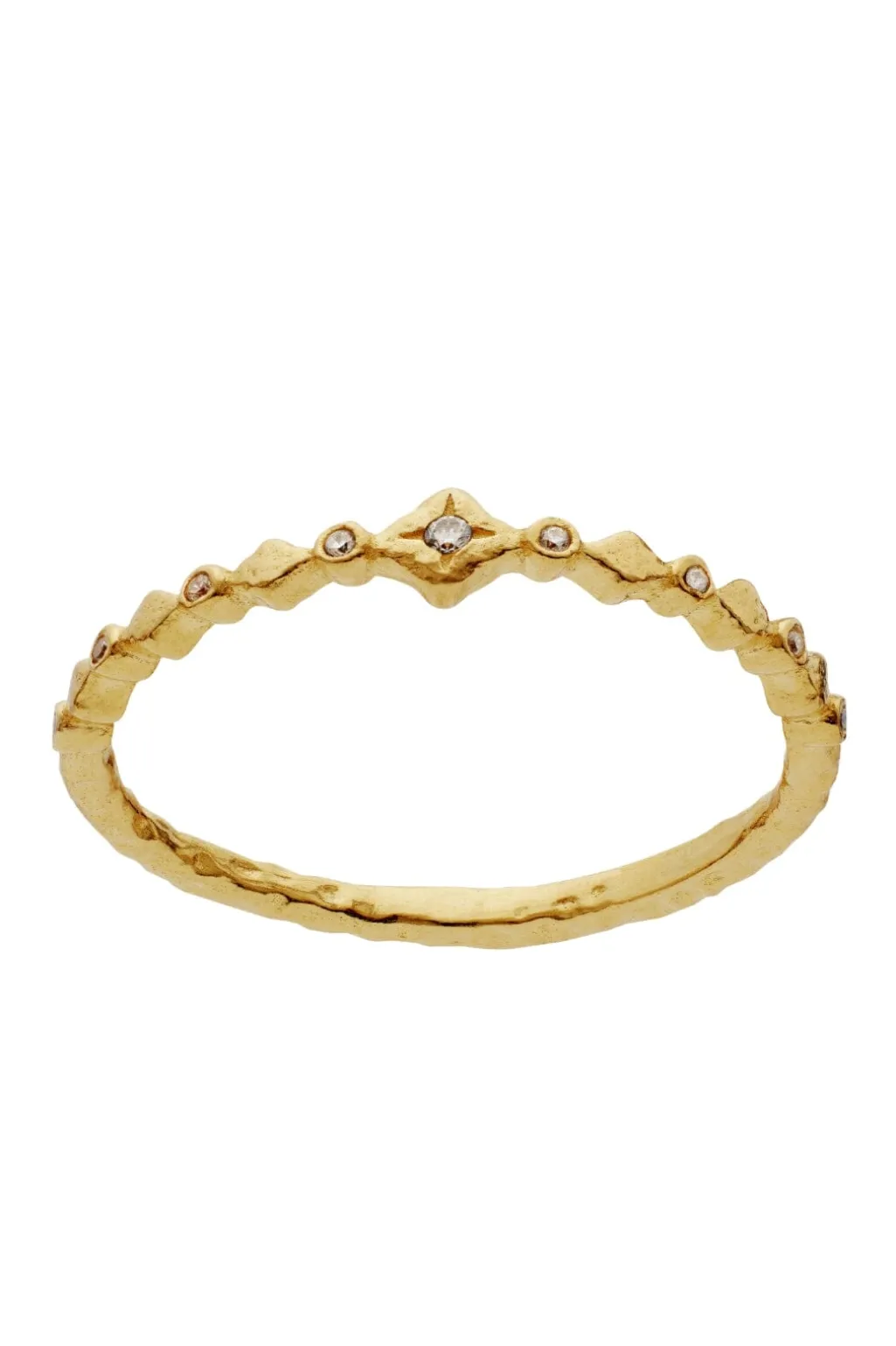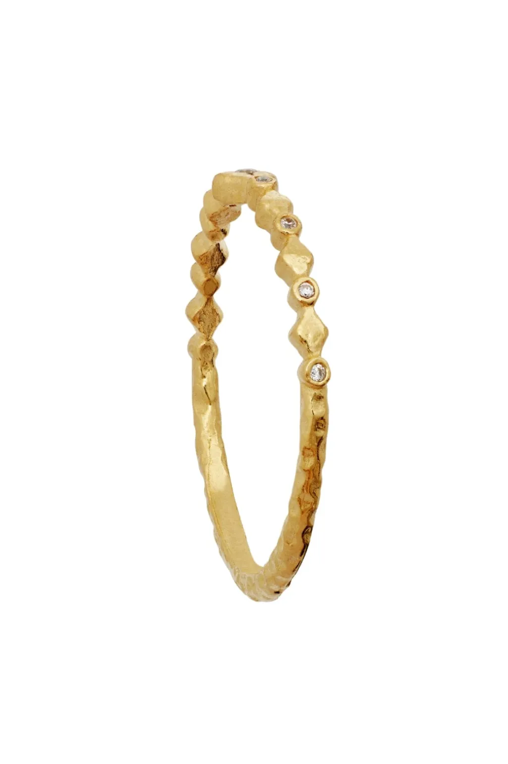 Ring fra Maanesten med en bølget struktur og glitrende zirkoner. Ringen har en gylden farve og en skinnende overflade.