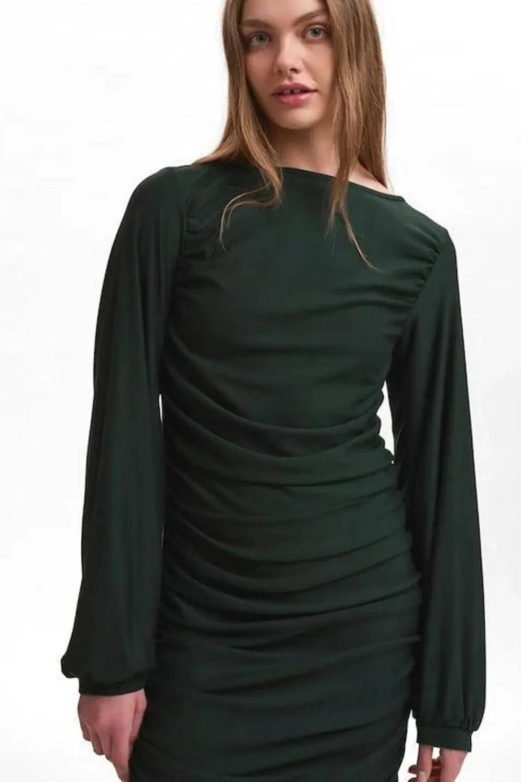 Mørkegrøn kjole fra Gestuz med rynkedetaljer og lange ærmer. Kjolen har en rund halsudskæring og går til midt på låret. Den passer til både hverdag og fest.