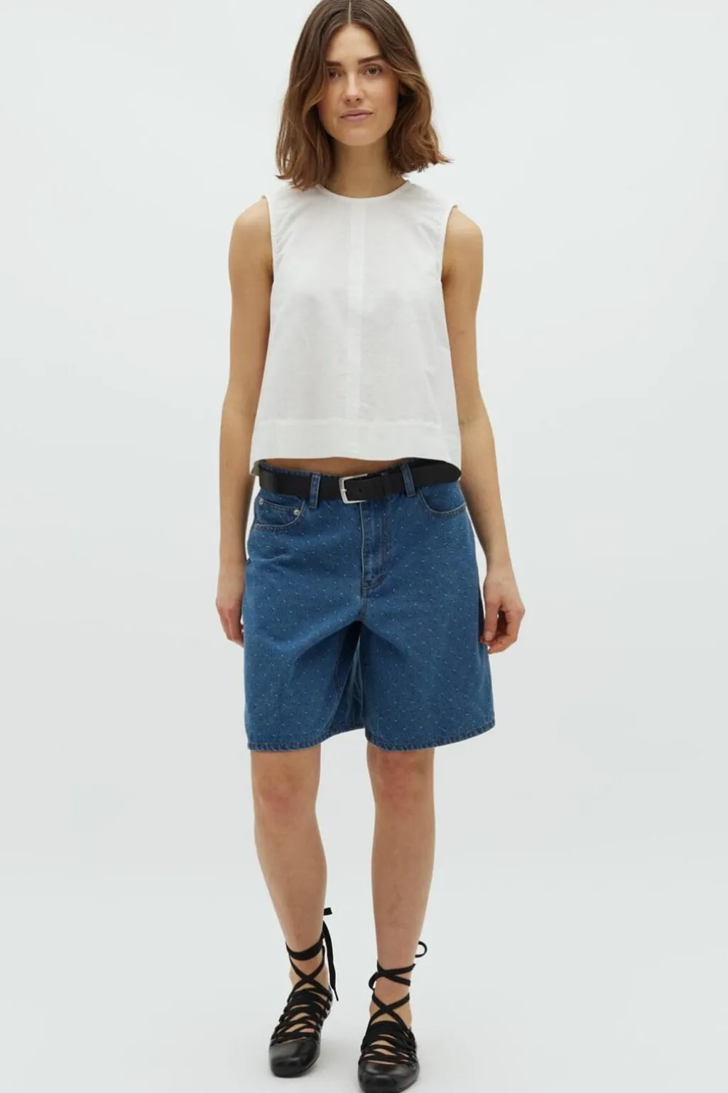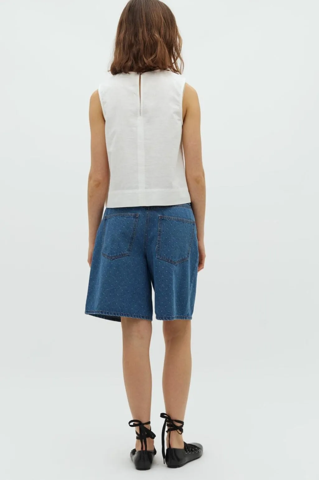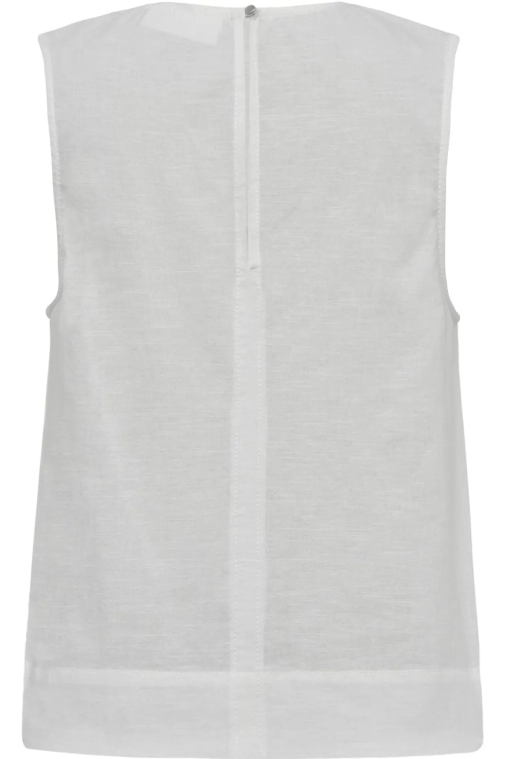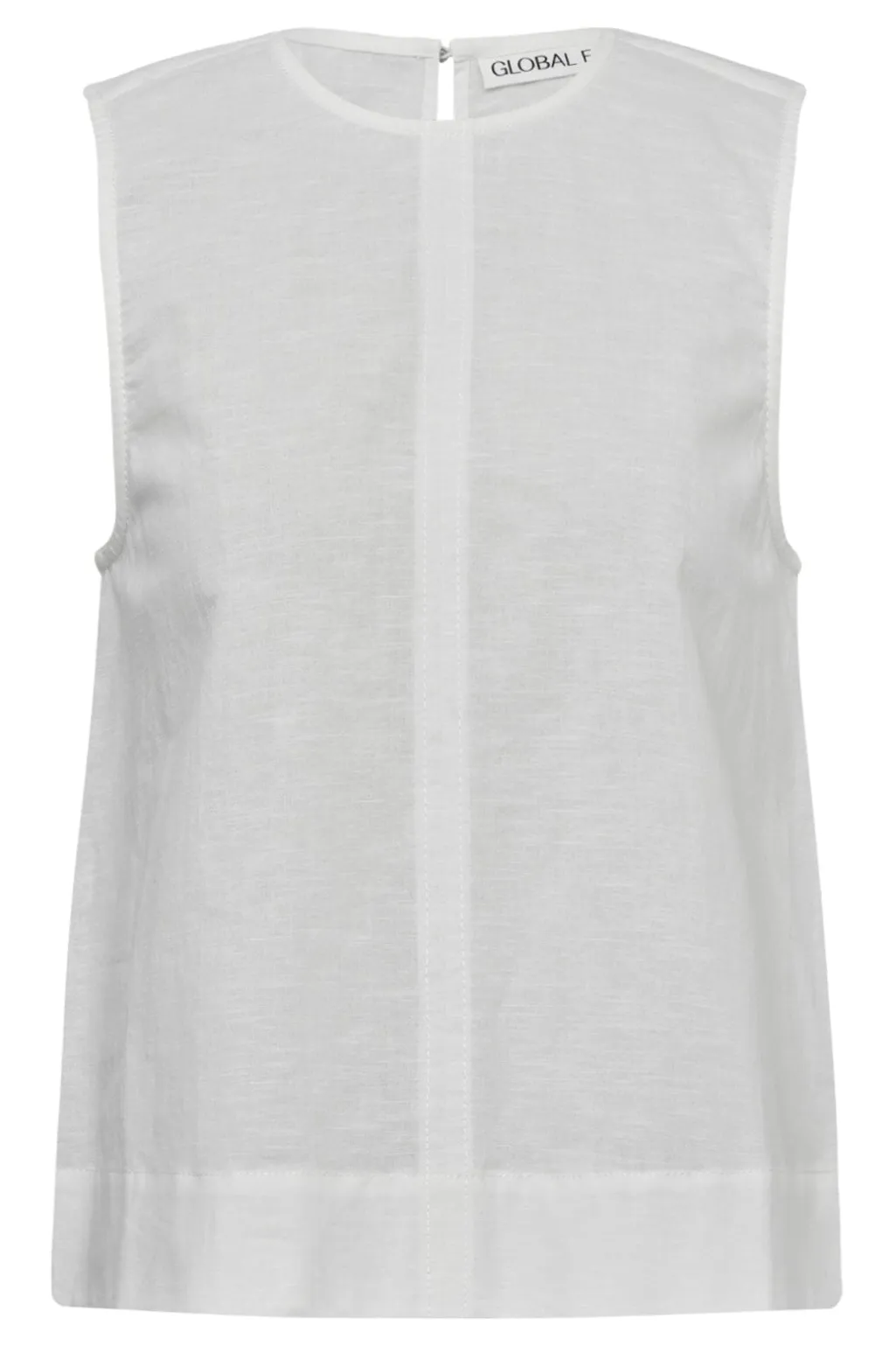 Hvid top fra Global Funk i en let blanding af bomuld og hør. Toppen har en rund halsudskæring og en lille åbning med knap i nakken. Den ærmeløse stil gør den luftig at have på.