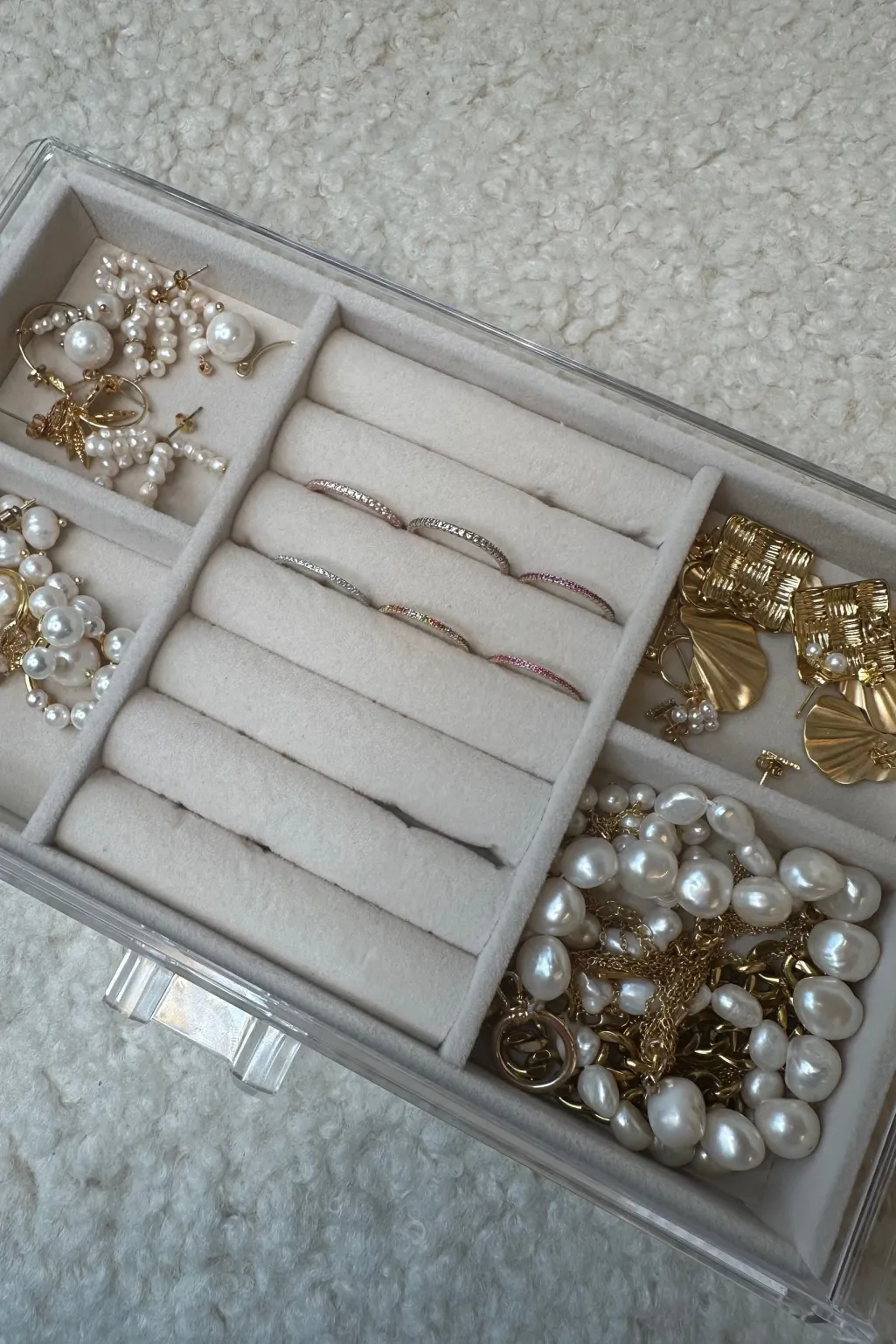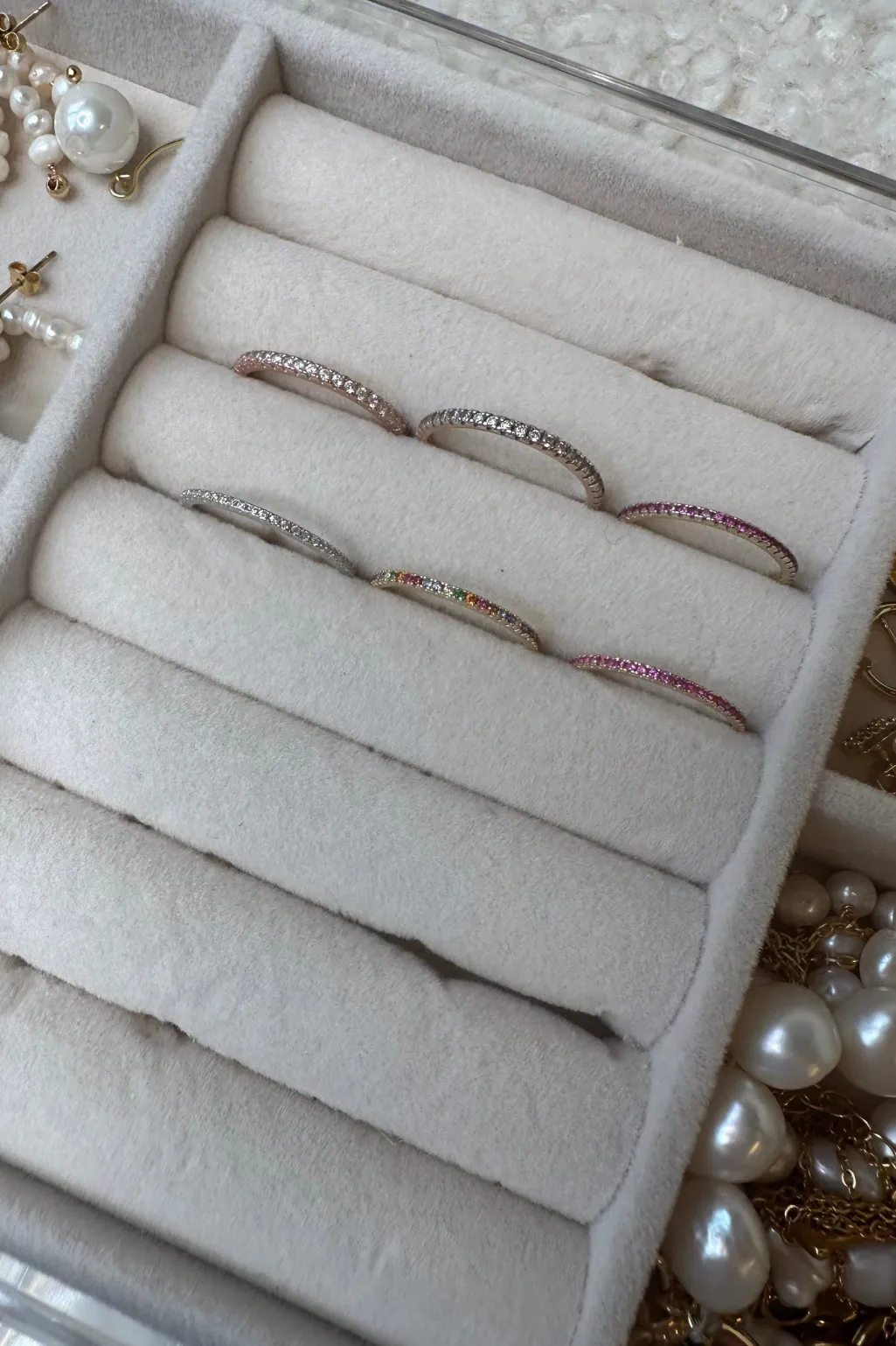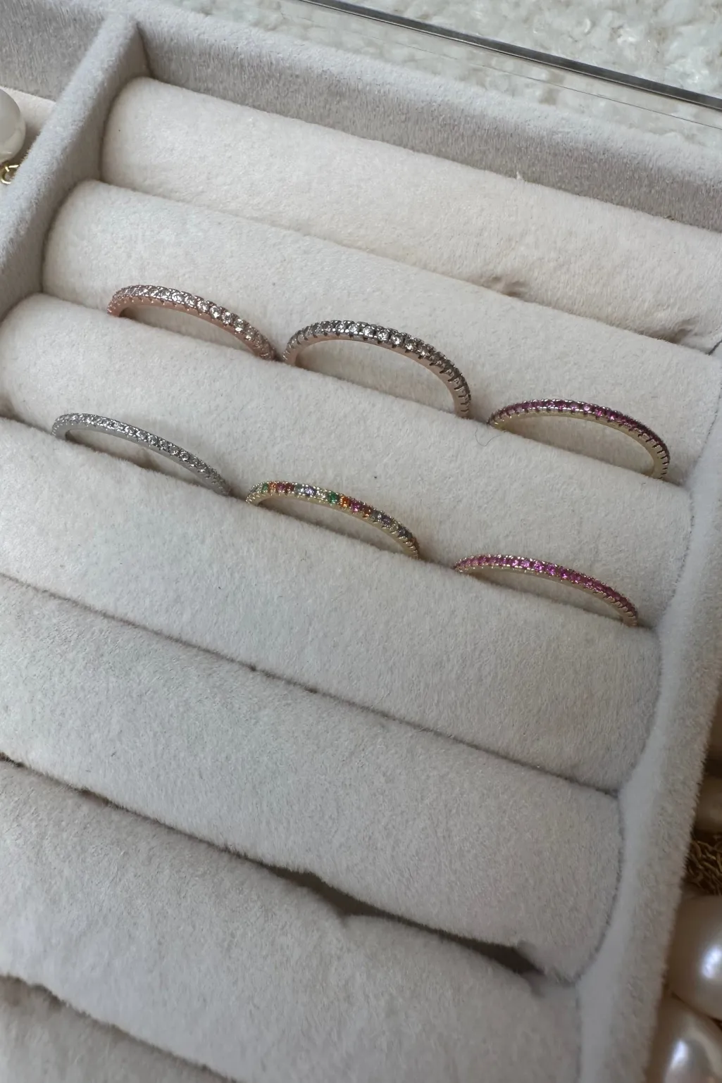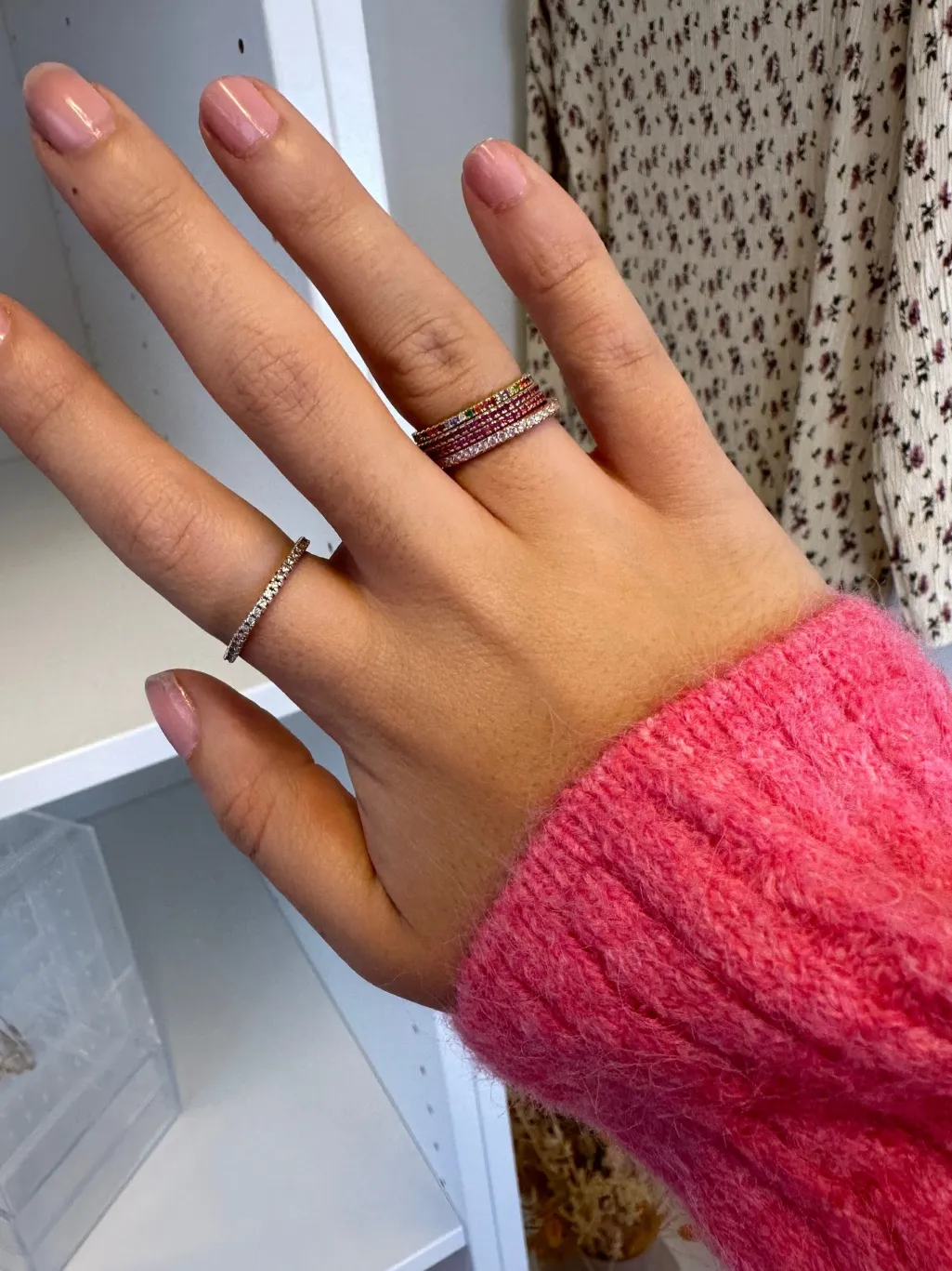 Ringe fra Mellow Moon med farverige sten i forgyldt og forsølvet sterlingsølv. De kan bæres enkeltvis eller stables sammen for at skabe forskellige kombinationer.