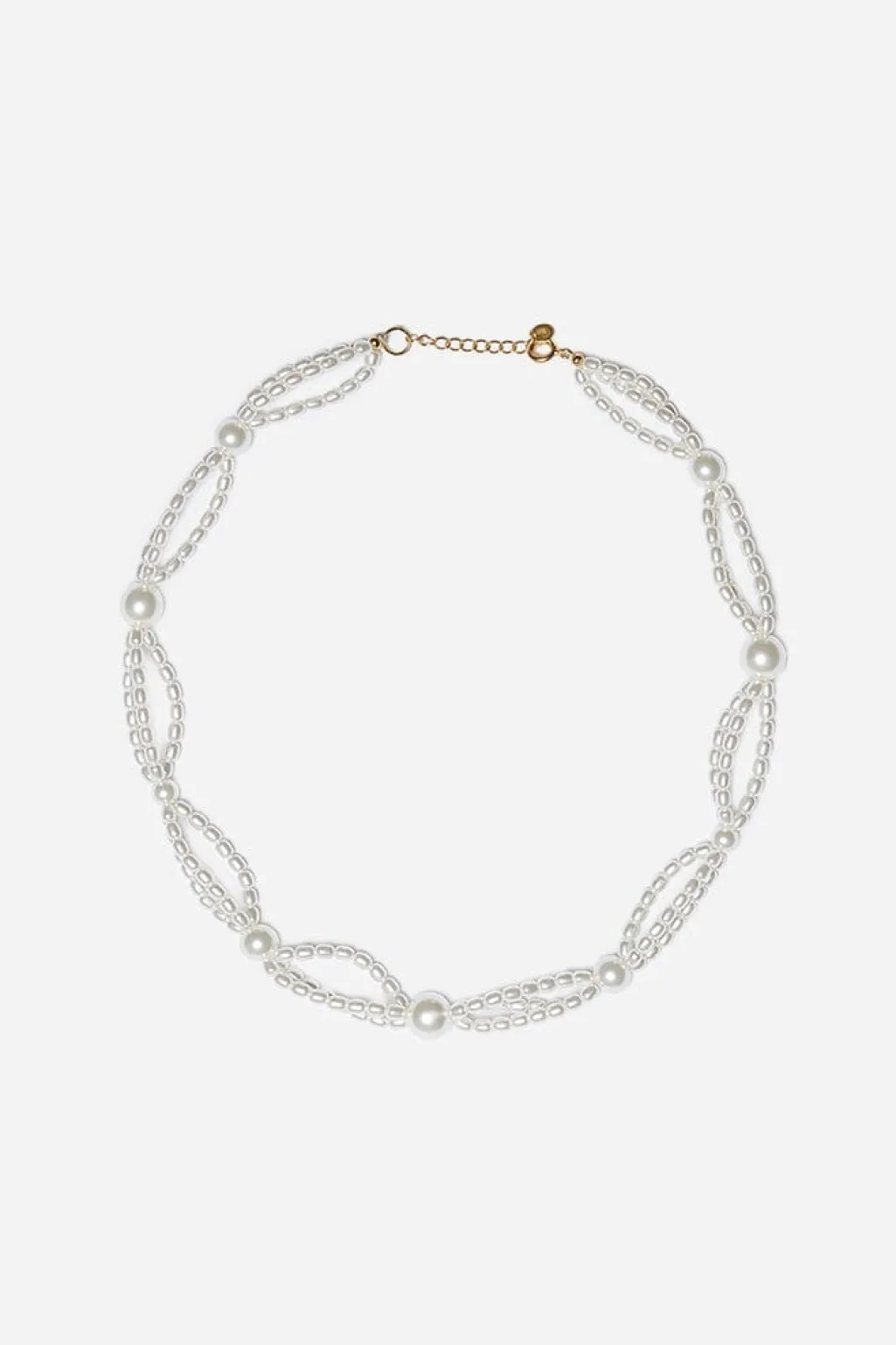 Forgyldt halskæde fra Sorelle Jewellery med hvide ferskvandsperler. Designet kombinerer kædestruktur med perler i et bølgende mønster.