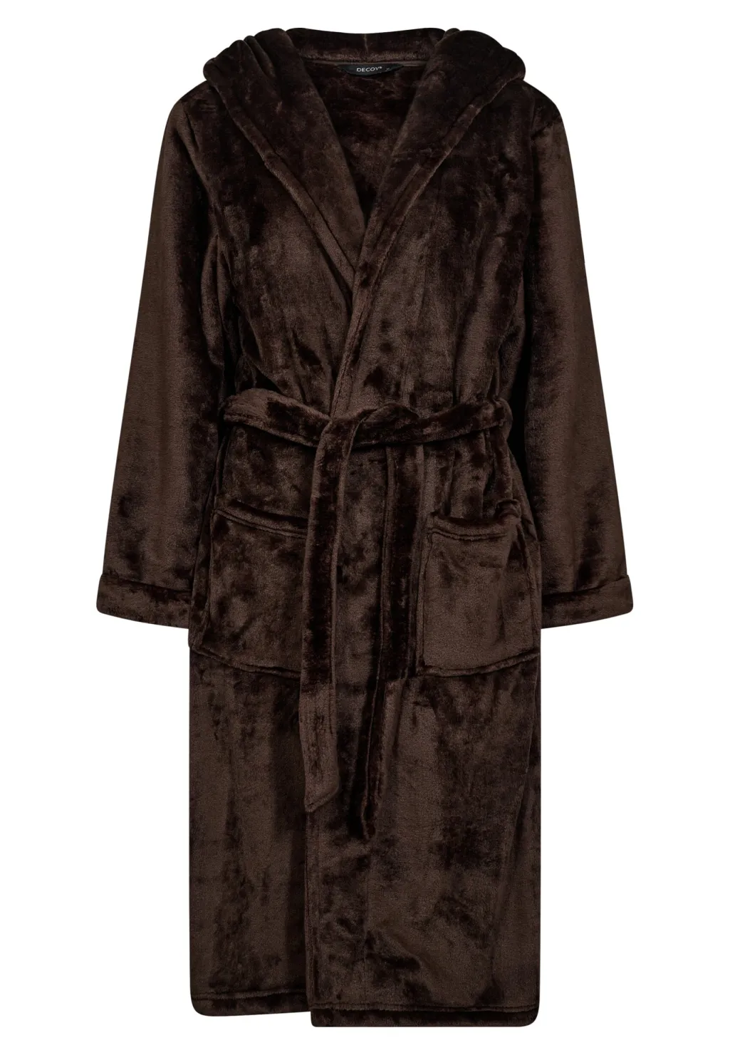 Brun badekåbe fra Decoy med hætte, bindebælte omkring taljen og to forlommer. Badekåben er lavet af 100 % polyester i en ensfarvet brun nuance.