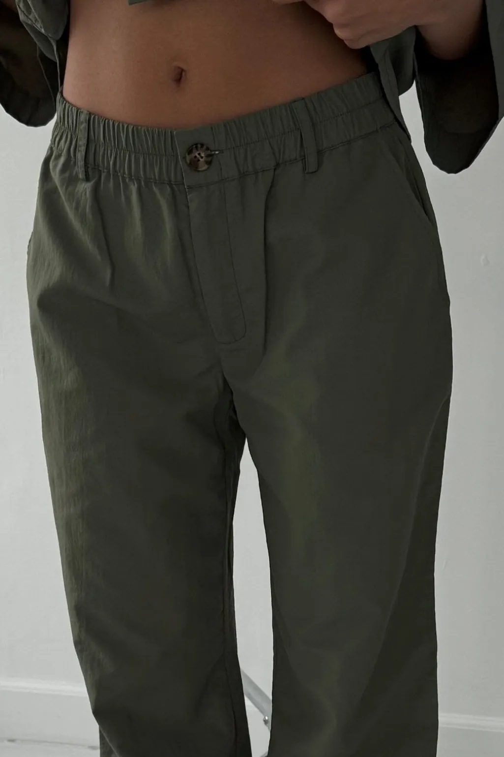 Army-farvede bukser fra Continue i gulvlængde. Bukserne har en afslappet stil med elastik og knapper i taljen.