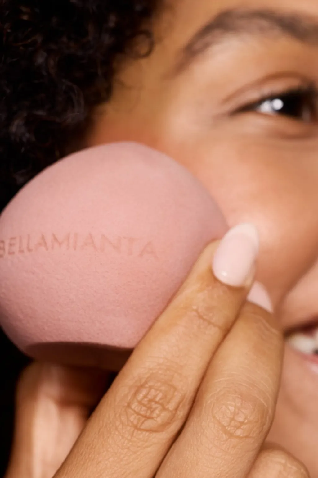 En rund makeupsvamp til foundation og pudder. Svampen kan bruges både våd og tør, og den fordobler sin størrelse ved våd anvendelse.