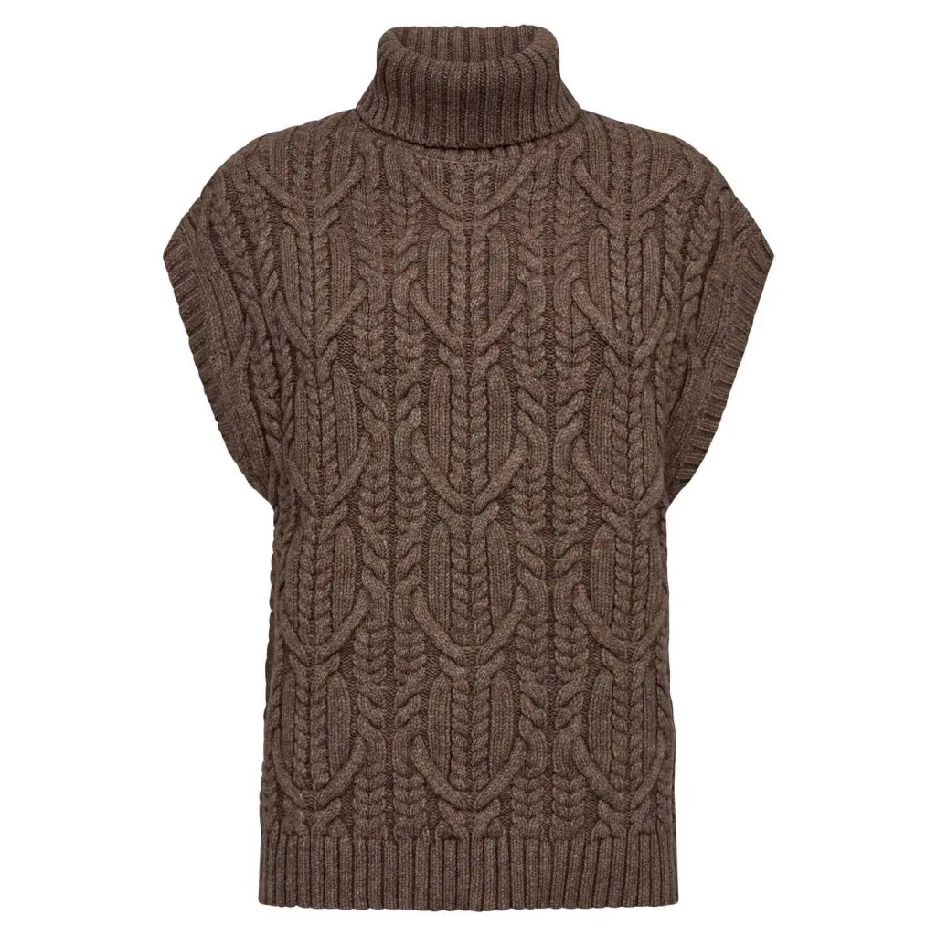 Strikket vest fra Co´Couture i en brun nougatfarvet nuance. Vesten har et kabelstrikmønster og en høj hals, der giver et rustikt udtryk.