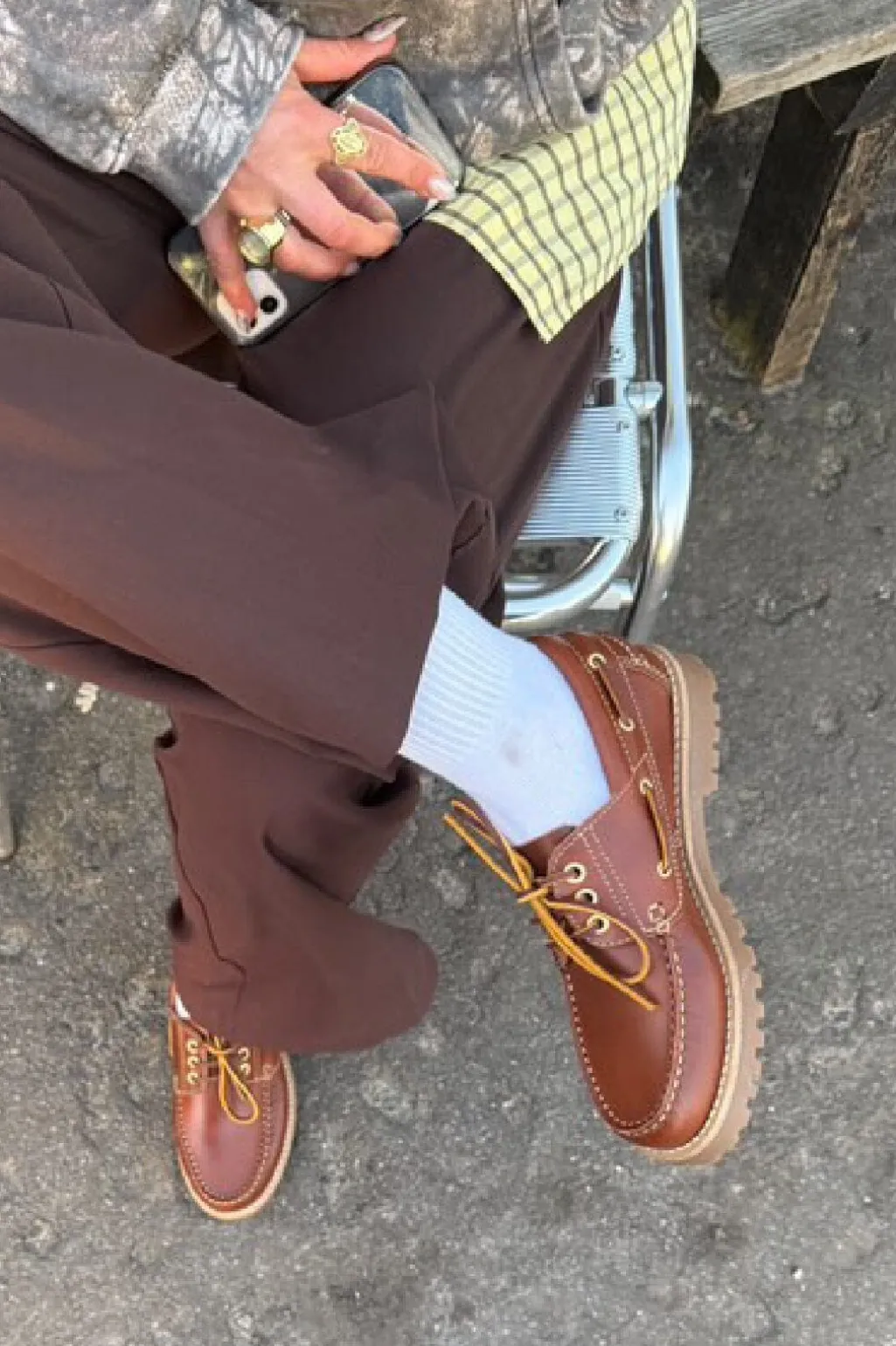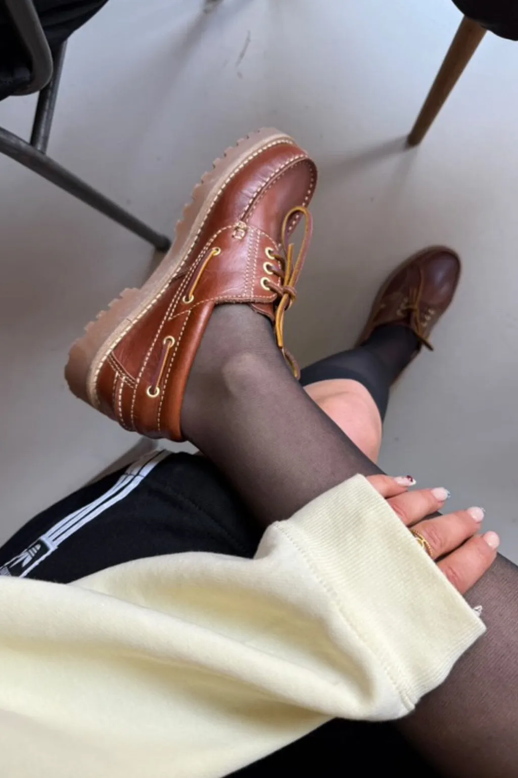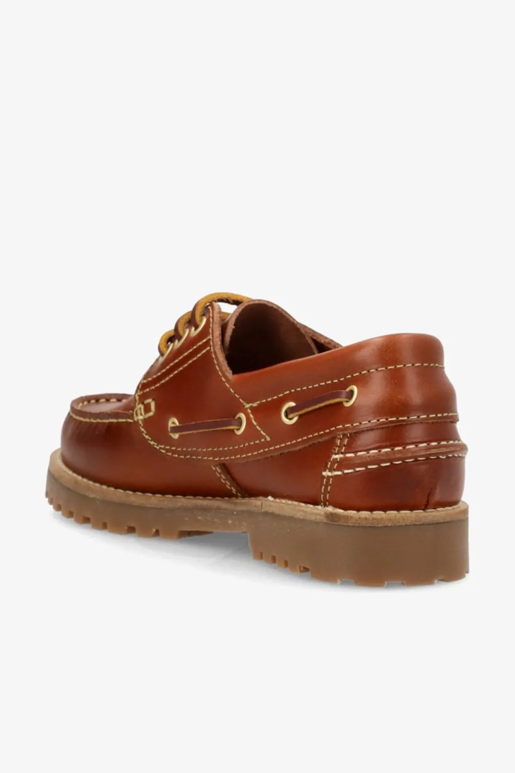 Lædersko i brandy farve med rund tå og snørebånd. Skoene har en lav hæl og er fremstillet af blødt læder med synlige syninger langs kanten.