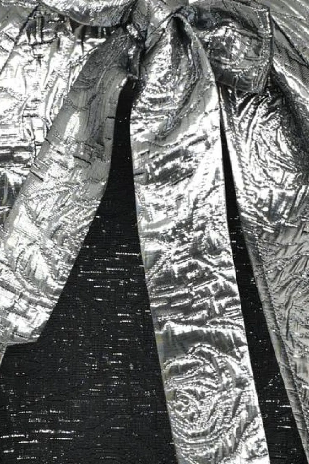 Kort kjole fra Sofie Schnoor i sølvfarvet stof med blomstermønster. Kjolen har puffede ærmer og rund hals med stor sløjfe i nakken. Den åbne ryg og peplumkant i bunden giver kjolen et festligt præg.