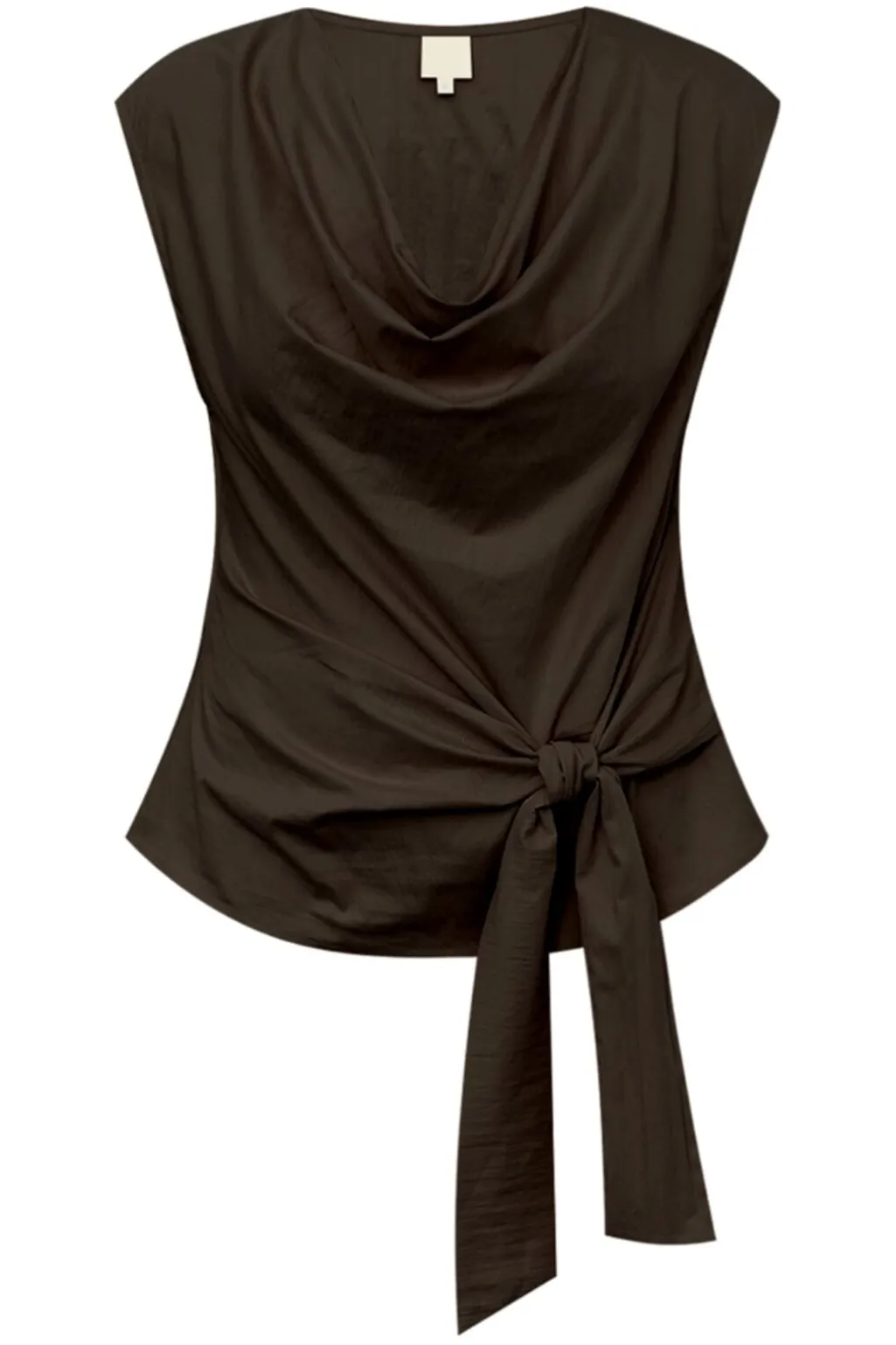 Sort bluse fra Gossia med ærmeløst design og draperet V-hals. Blusen har bindebåndsdetalje ved taljen og en slim fit-pasform.