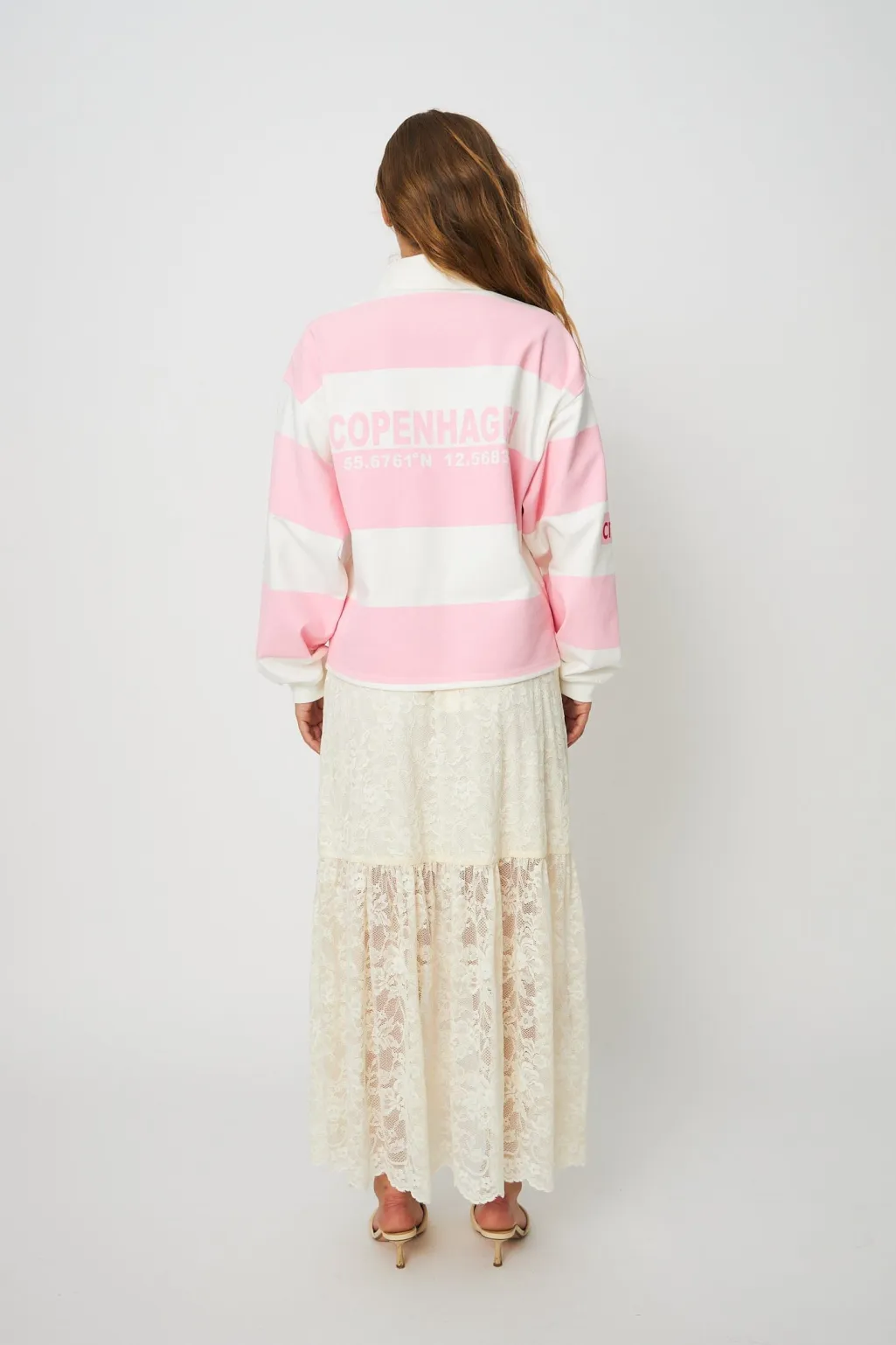 Hvidt ankellangt skørt fra Cras med blomstret blondemønster og flæsedetaljer. Skørtet har en elastisk talje med knapper og et lag af blonde i bunden.