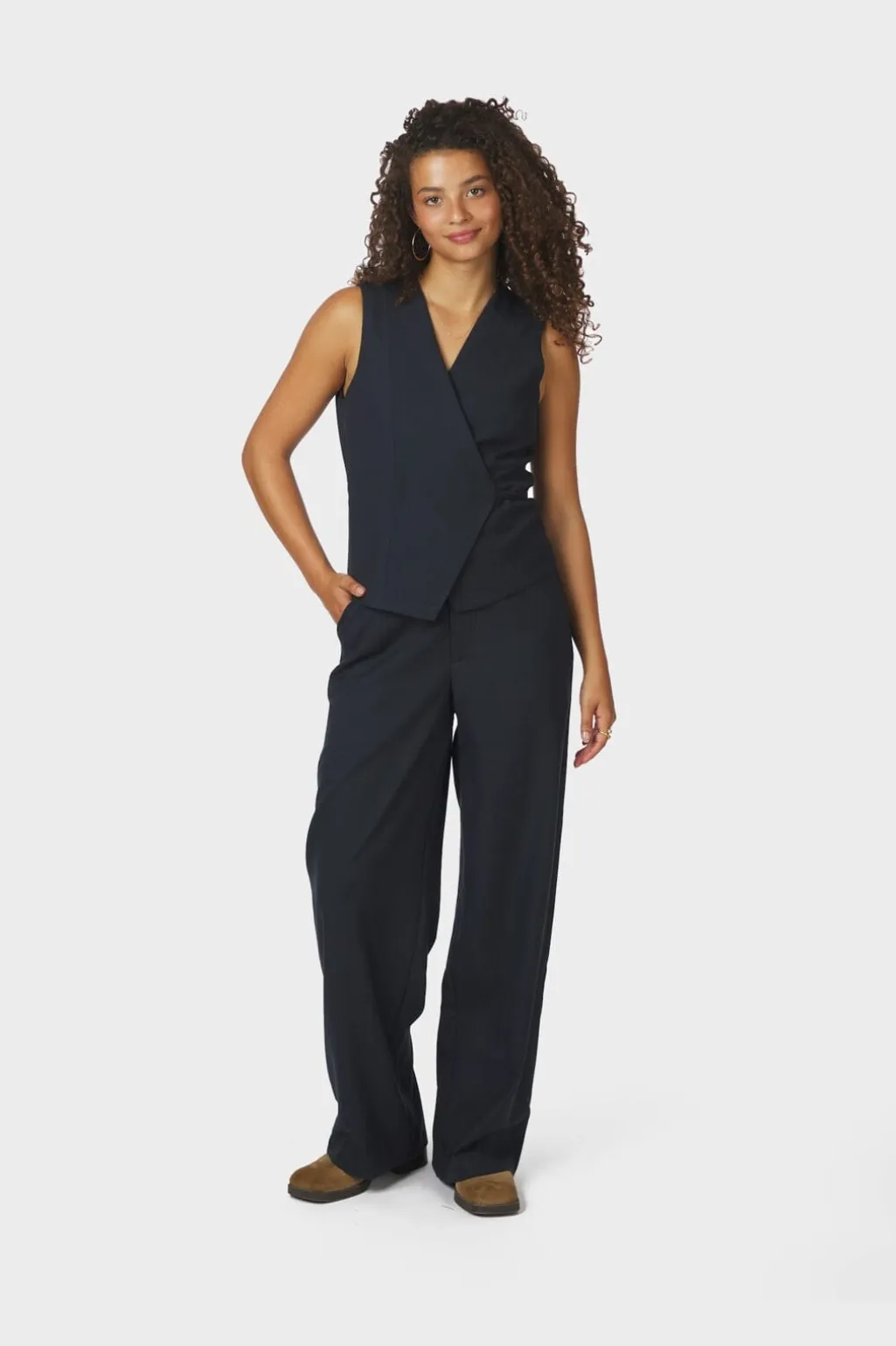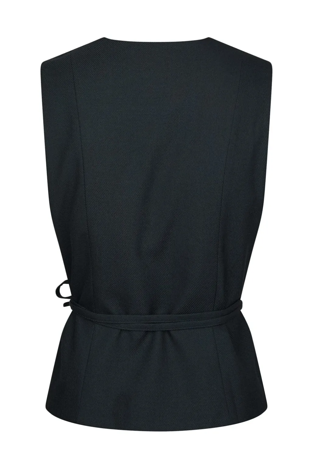 Mørkeblå vest fra Neo Noir med V-udskæring og slim fit-snit. Den har bindebånd i taljen og et meleret stof, der giver struktur til designet.