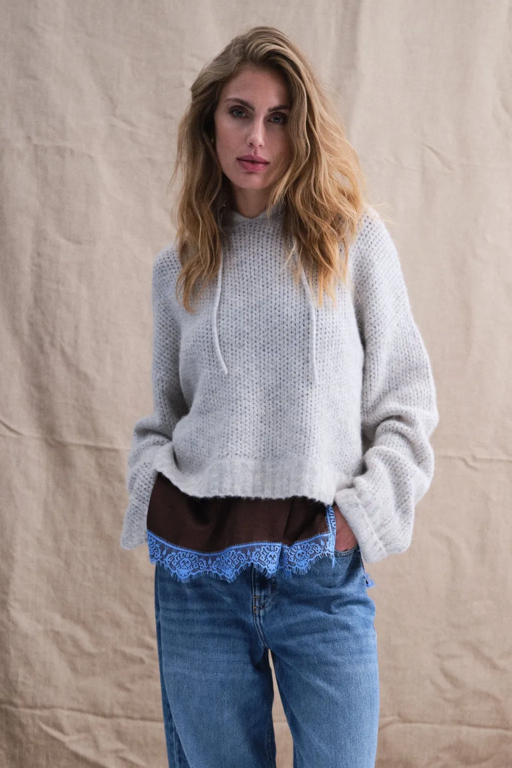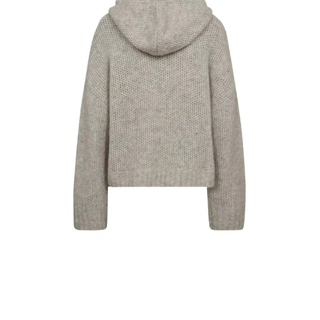 Hoodie-jumper fra Gossia i lys grå meleret farve med strikket tekstur og hætte med snoretræk.