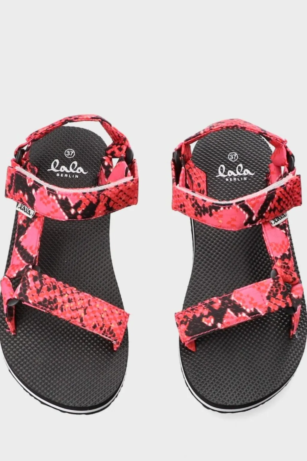 Sandal fra Lala Berlin i pink og sort med slangeprint. Den sorte sål har en hvid stribe, og sandalen er lavet af printet ripstop med velcrolukning.
