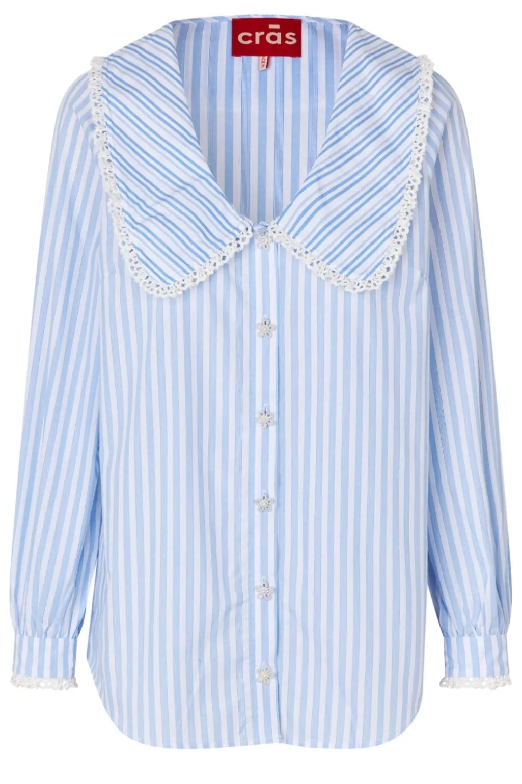 Lyseblå og hvidstribet skjorte fra Cras med stor Peter Pan-krave og blondekant. Skjorten har perleknapper og flæsedetaljer langs kraven og ærmerne.