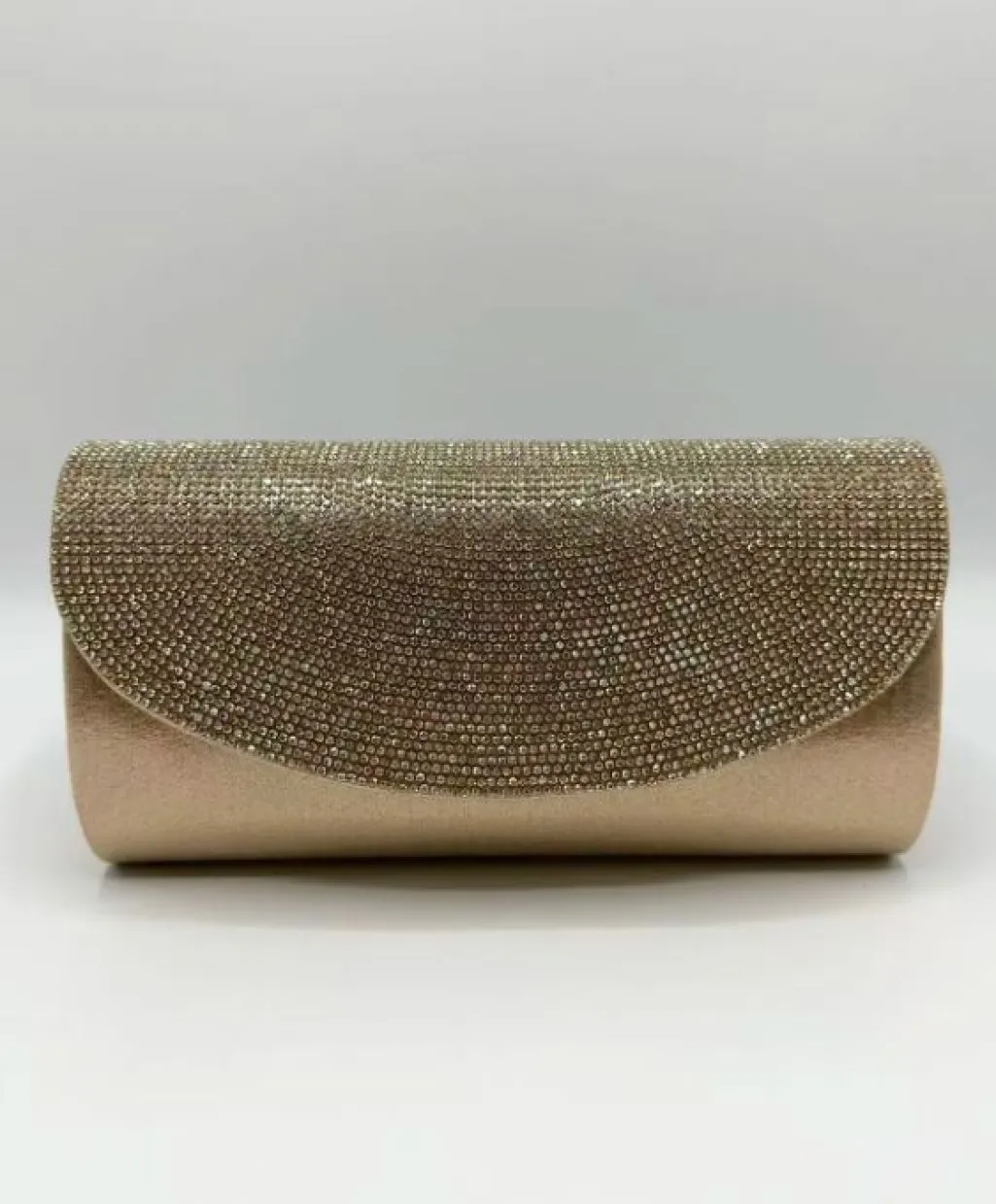 En guldfarvet clutch fra Anobel Copenhagen med en glitrende frontflap. Tasken har en afrundet form og er lavet af syntetisk materiale.