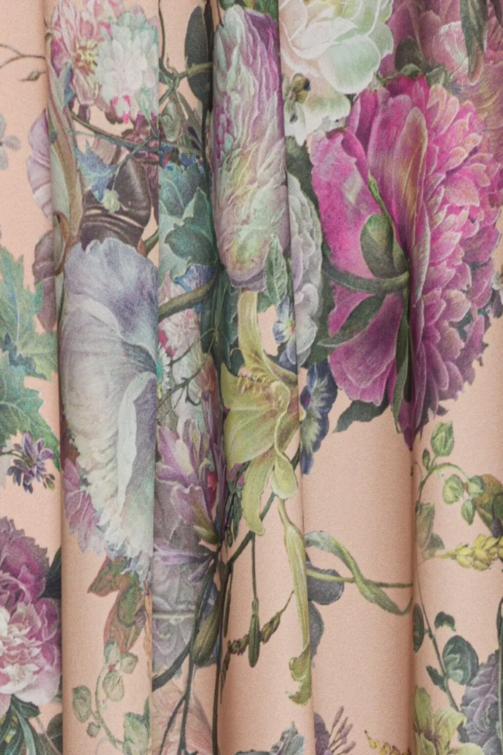 Ferskenfarvet nederdel i satin med blomstermønster i pink, grøn og lilla. Den har høj talje med elastik og ankellængde med flæser.