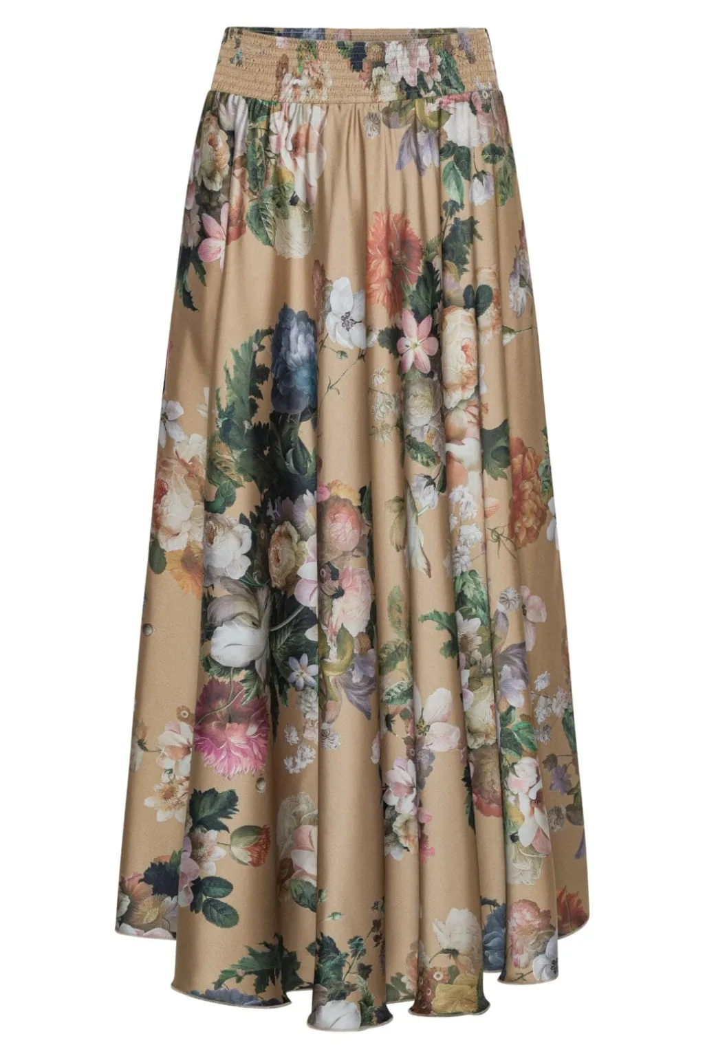 Lang nederdel i beige med blomstermønster i pink, grøn og blå. Den bløde polyester har flæsedetaljer og en elastisk talje, der giver god bevægelighed.