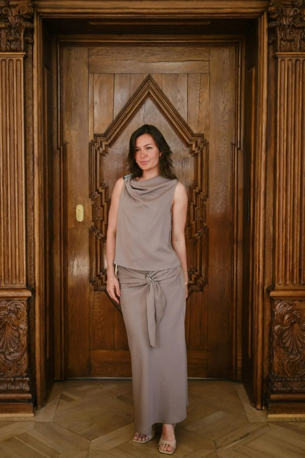 Ærmeløs top fra Neo Noir i mørk taupe satin. Toppen har en draperet halsudskæring og et metalspænde ved skulderen, som giver den et særpræg.
