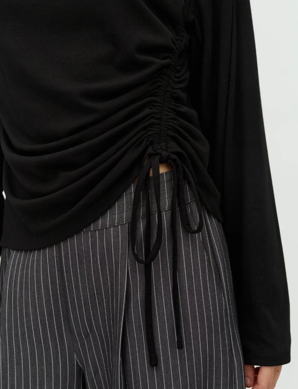 Sort top fra MbyM med lange ærmer og høj hals. Toppen har bindebånd i siden og flæsedetaljer.