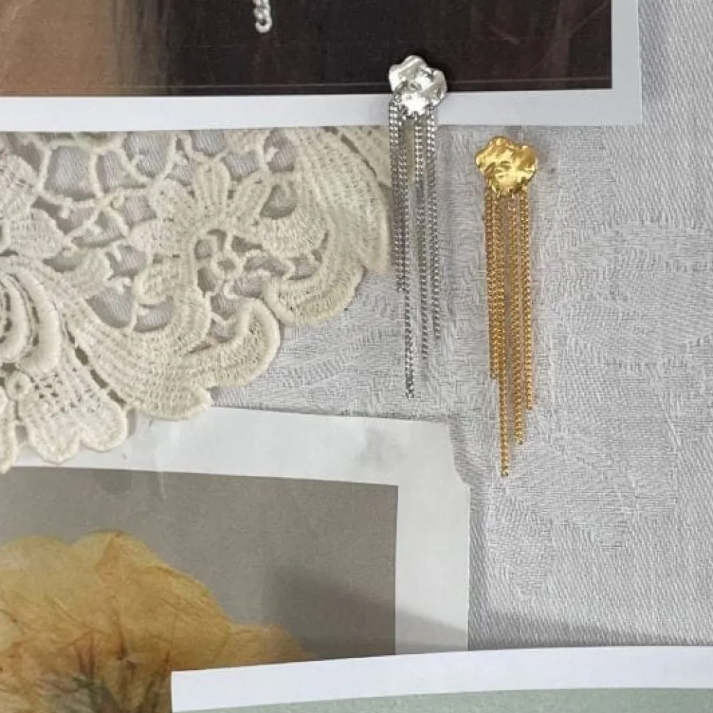 Sølvørering fra Stine A med en skaldformet top og fire kæder. Den bankede overflade på toppen skaber et særligt spil i lyset, mens kæderne bevæger sig frit.