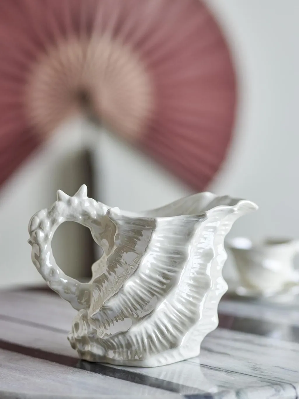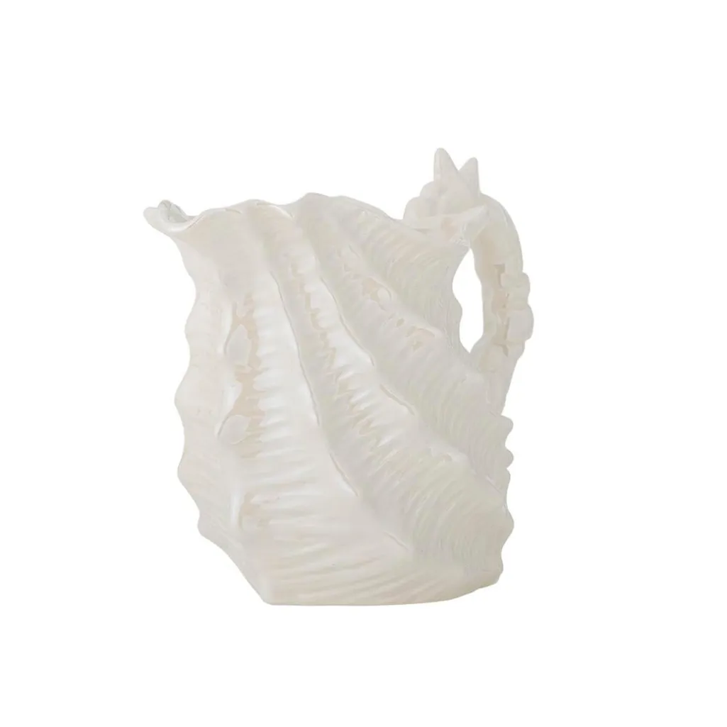 Hvid kande fra Bloomingville, lavet af stentøj med en muslingeskalsform. Overfladen er bølget og blank, og hanken har detaljer med muslinge- og søstjernemotiver.