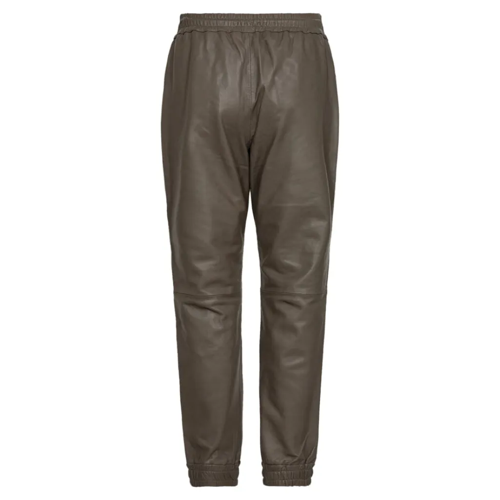 Læderbukser fra Co´couture i farven Elephant. Bukserne har en afslappet jogger-stil med elastik og snøre i taljen samt elastiske manchetter ved anklerne.