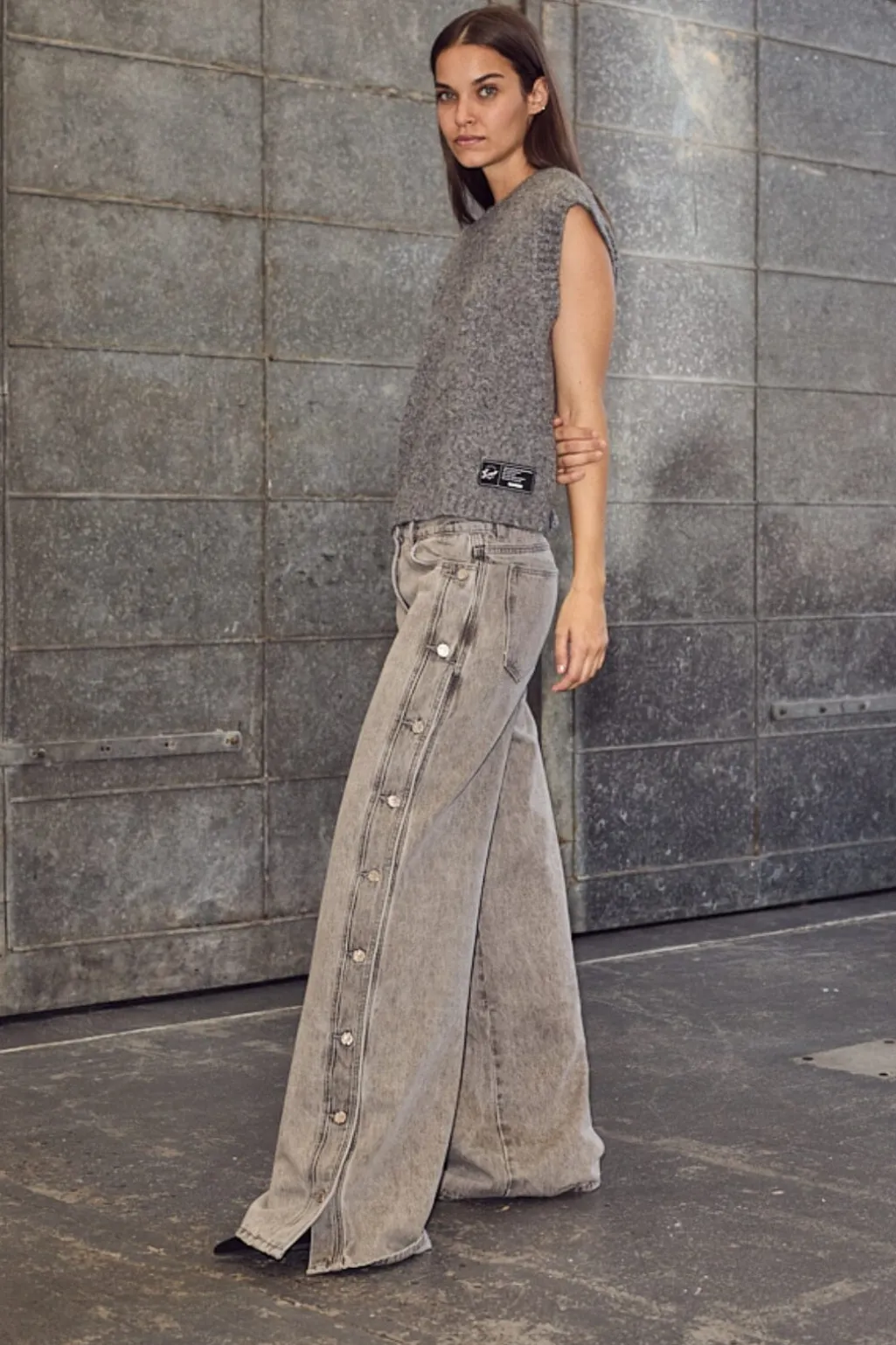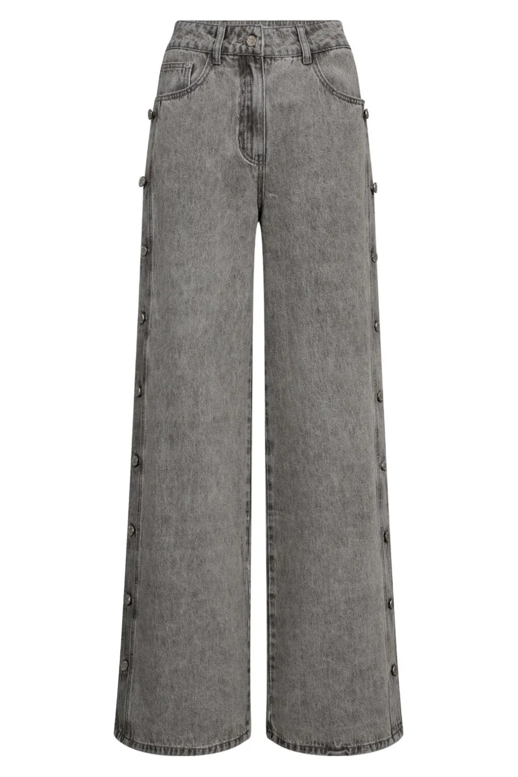 Jeans fra Haute L’Amitié i lys grå med knapper langs sidepanelerne. Den brede benform giver et afslappet look med gulvlængde.