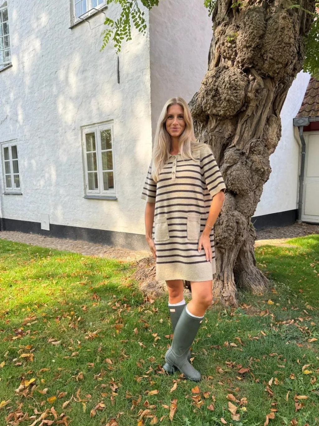 Strikket kjole fra BYIC x Molly&My med brune og beige striber. Kjolen har en polo-krave med tre knapper og to frontlommer.
