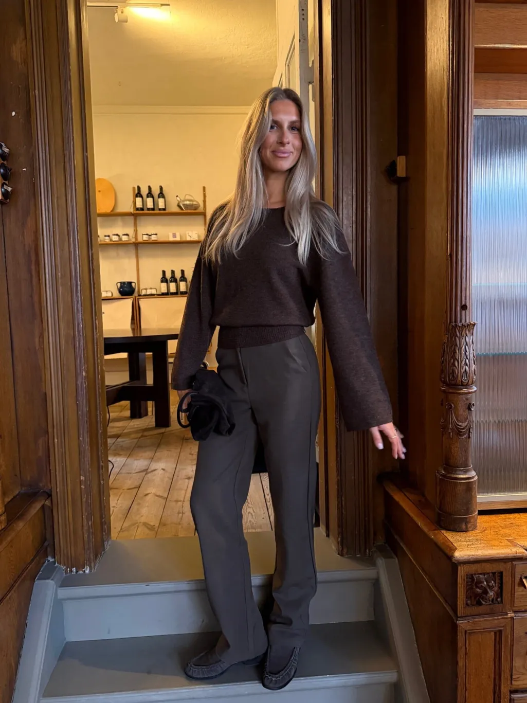 Mørkebrun pullover fra BYIC, strikket i et blødt stof af polyester, nylon og uld. Farven er en varm, mørkebrun nuance.