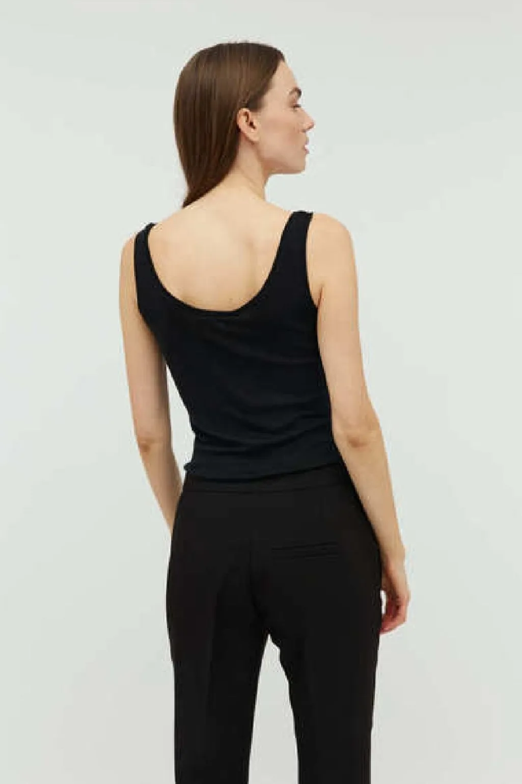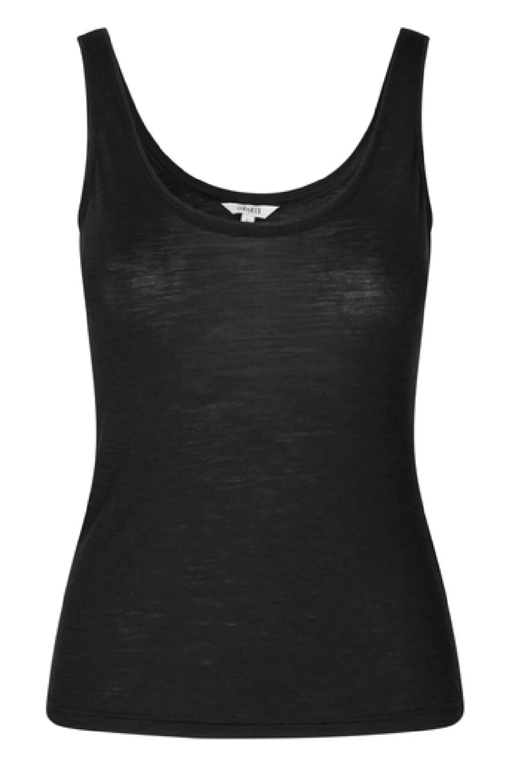 Sort tanktop fra Mbym i merinould med rund halsudskæring og brede skulderstropper. Den tætsiddende model har en let gennemsigtig tekstur og en kropsnær silhuet.