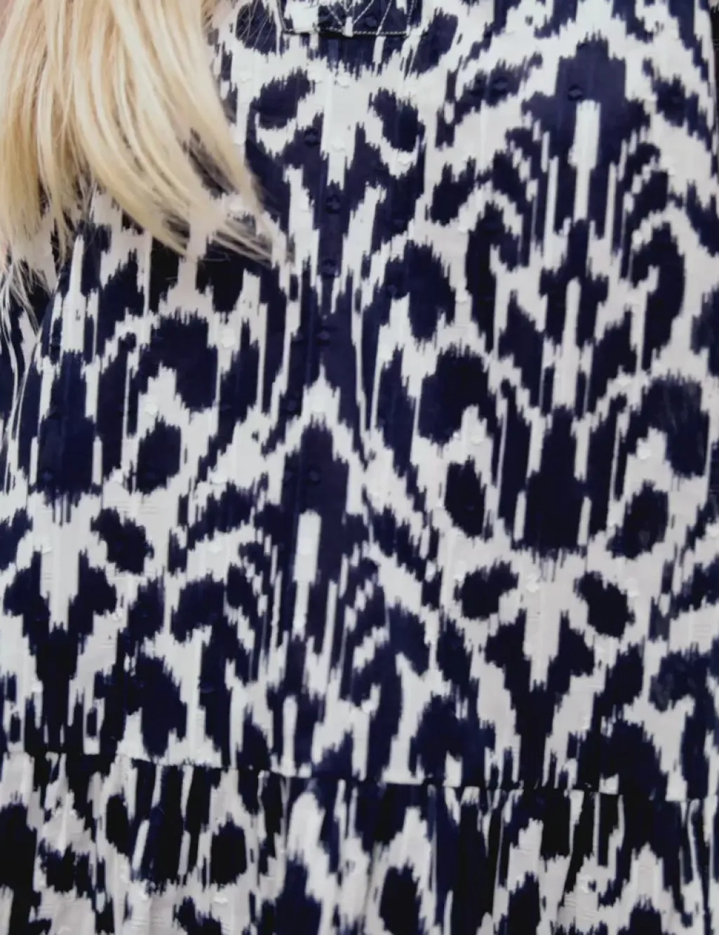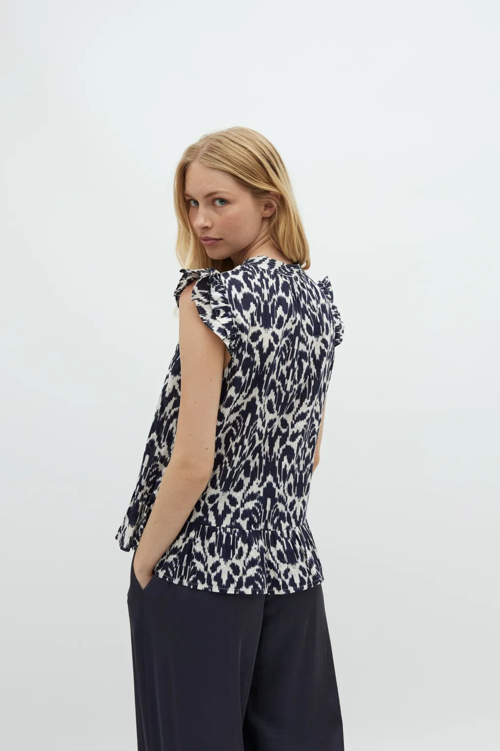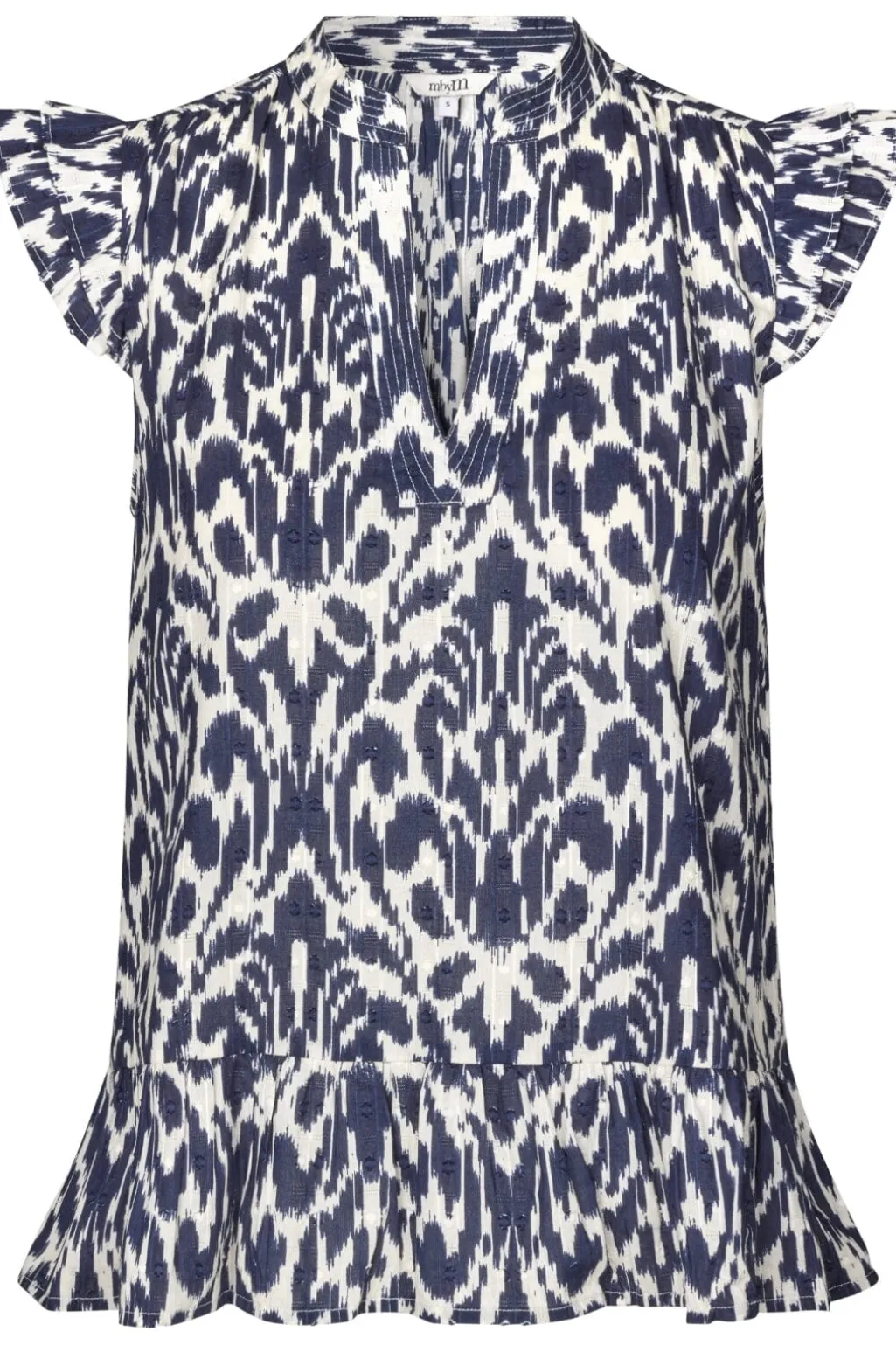 Bluse fra MbyM i mørkeblå og hvid med ikat-inspireret print. Den har flæsedetaljer ved ærmerne og en v-udskæring med knapper foran.