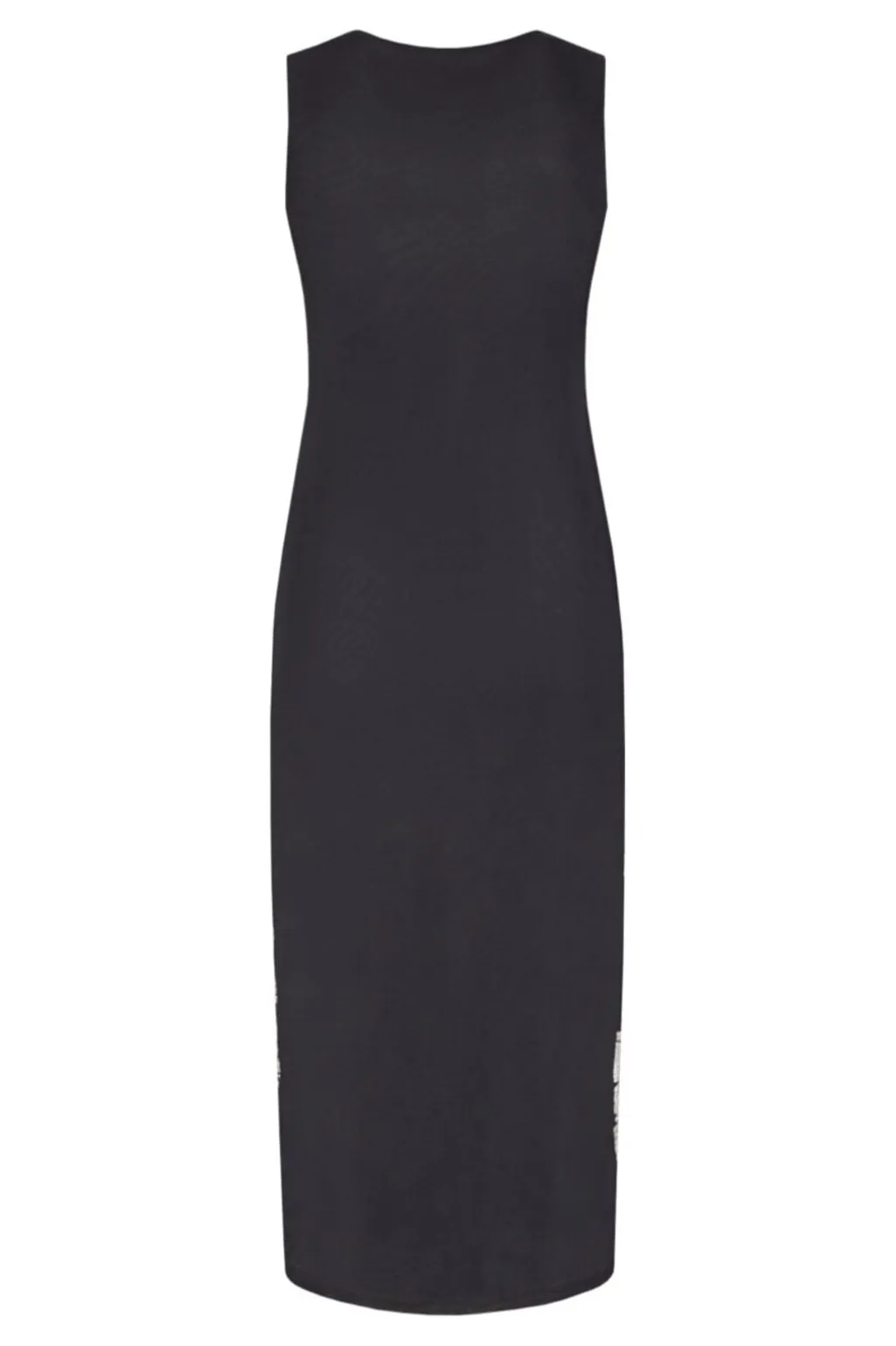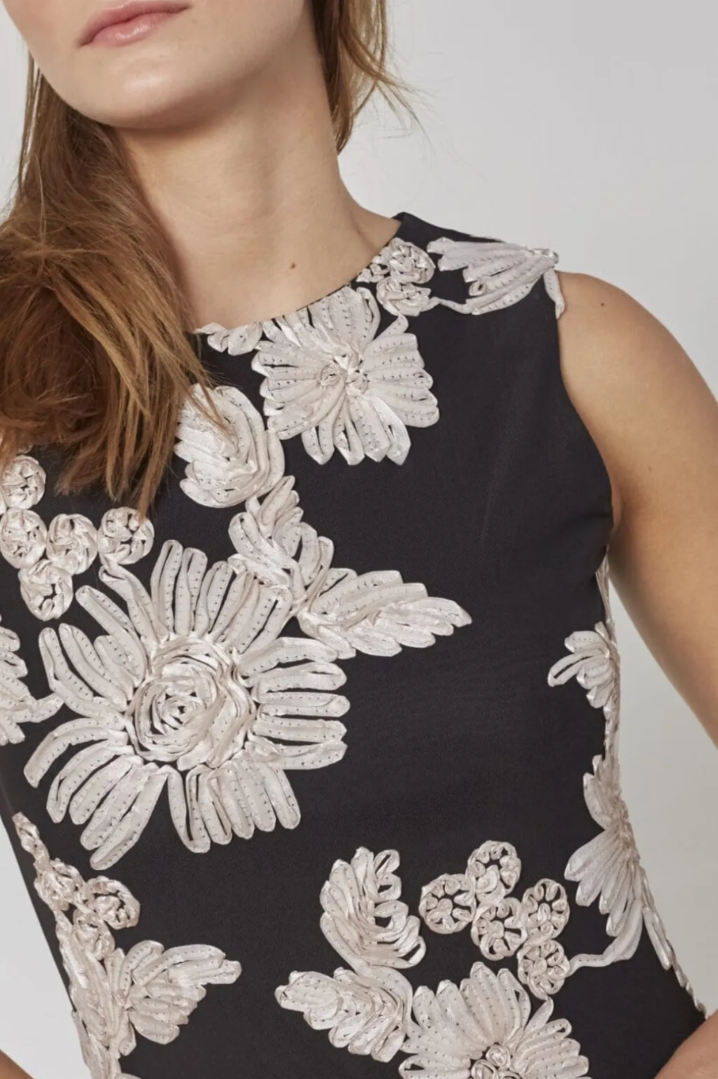 Sort kjole fra Sisters Point med broderede blomstermotiver i champagnefarve. Kjolen er ærmeløs og har en figursyet silhuet, der går til anklerne.
