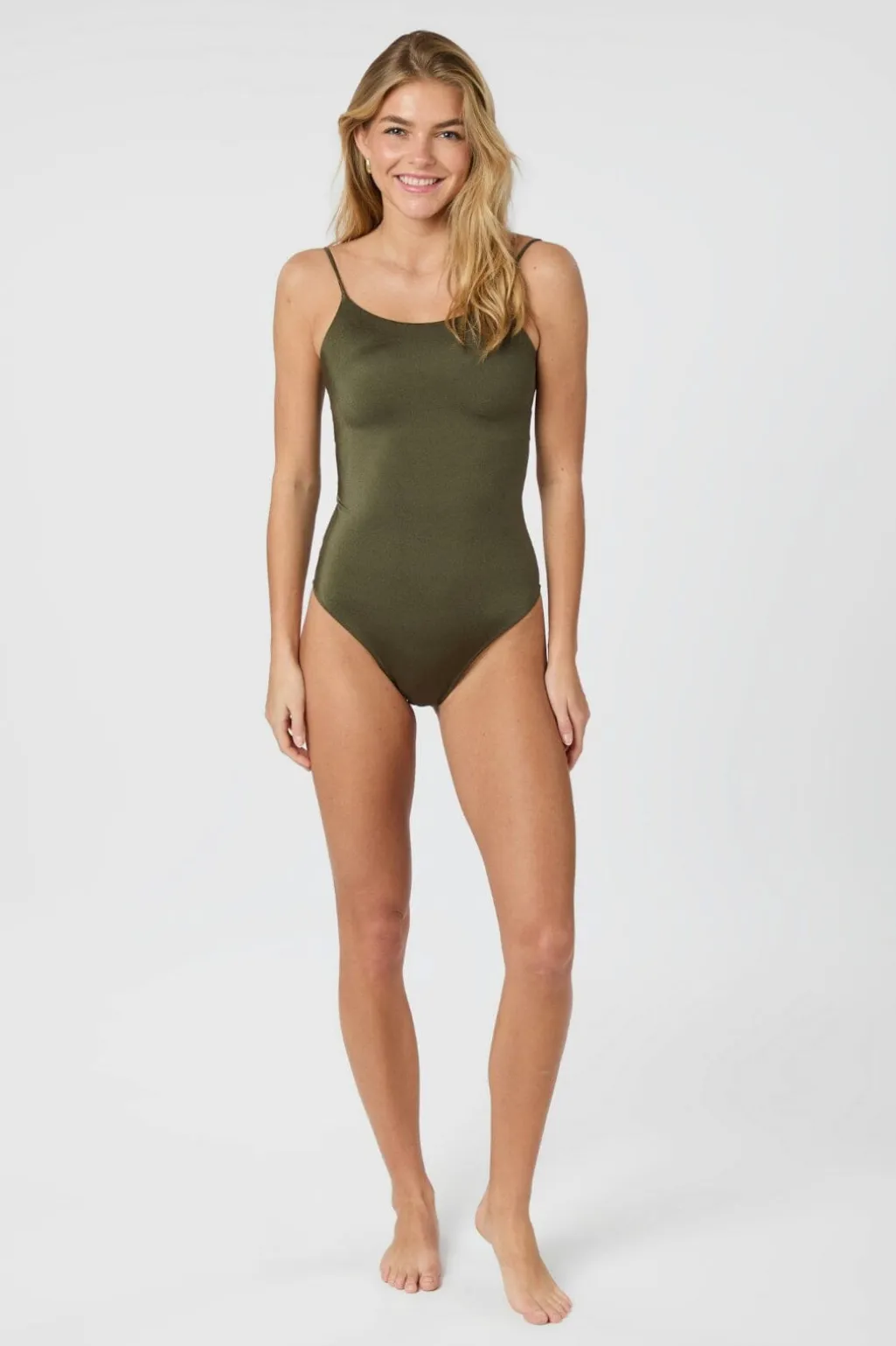 Armygrøn badedragt fra Neo Noir med krydsede stropper på ryggen. Den tætsiddende model har en rund halsudskæring og aftagelig padding i skålene.