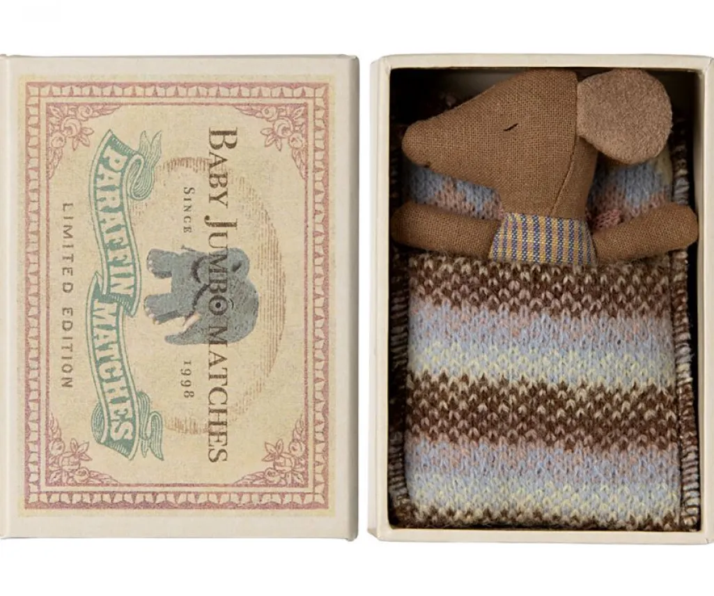 En lille mus i tændstikæske fra Maileg med tilhørende tøj og sengetøj. Musen kommer i en vintage-inspireret æske med et stribet outfit og en lyserød sløjfe.