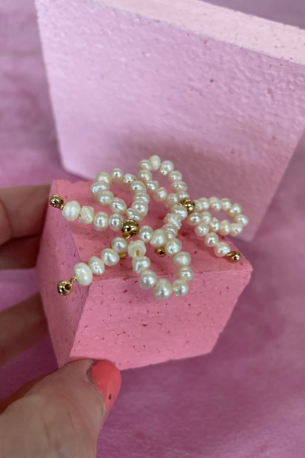 Forgyldte ørestik fra Mellow Moon med sløjfeformet design. De små perler danner en fin sløjfe med en guldperle i midten. Ørestikkene har en cream-hvid farve.