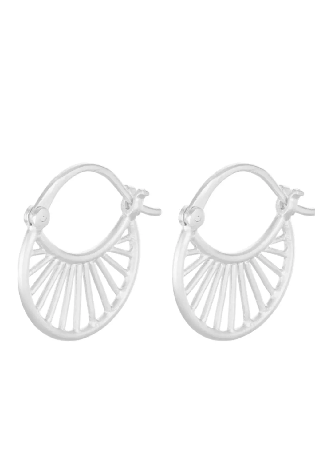 Sølvøreringe fra Pernille Corydon med cirkulær form og stråledesign. De små øreringe er håndlavet i sterling sølv med et karakteristisk mønster af stråler.